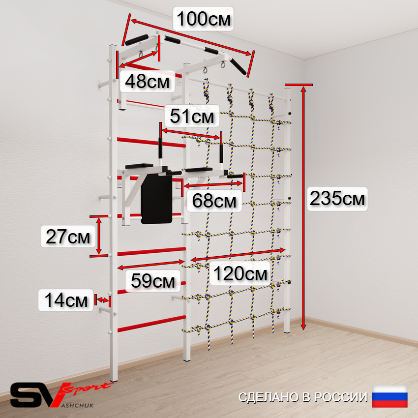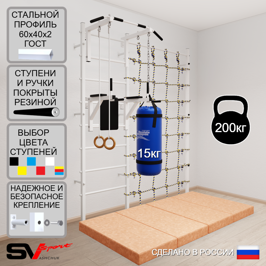 КОМПЛЕКТАЦИЯ: Шведская стенка Sv Sport усиленная (профиль вертикальных стоек 60 х 40 х 2 мм), Турник Sv Sport стандарт к ШС, Брусья Sv Sport к ШС, Kольца деревянные, Цепь удлинитель 90см, Мешок боксерский 15кг, Спортивный мат 100 х 200 х 10 см складной, Канатный лаз.