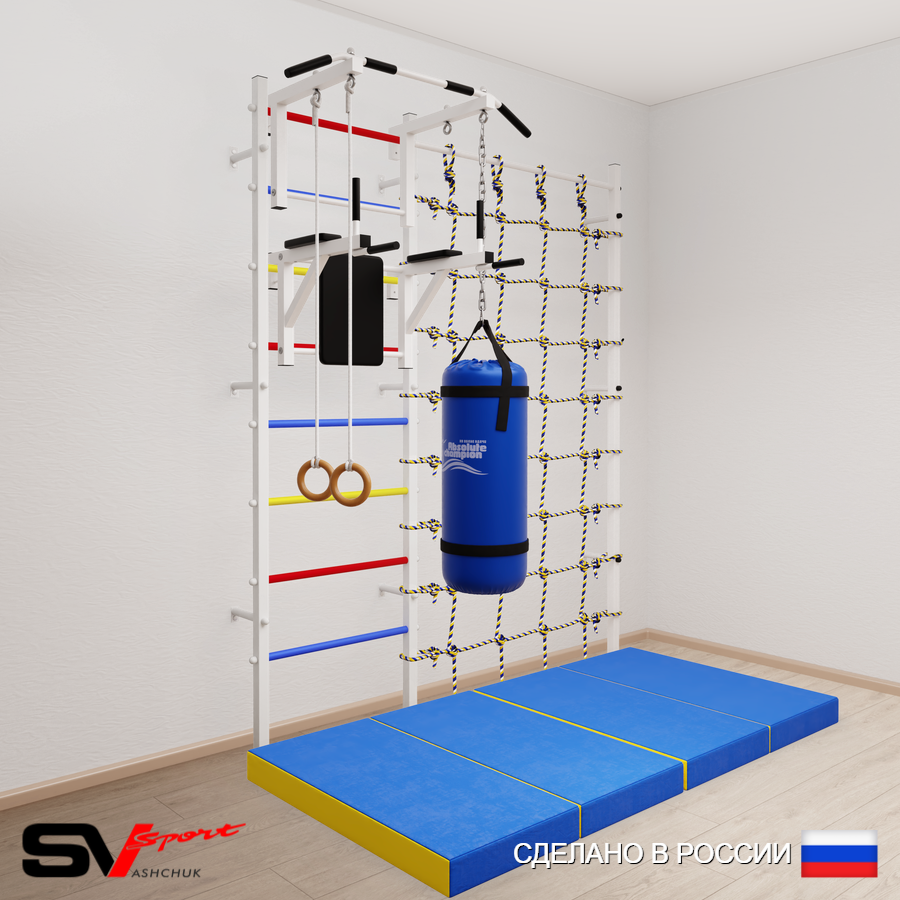 КОМПЛЕКТАЦИЯ: Шведская стенка Sv Sport усиленная (профиль вертикальных стоек 60 х 40 х 2 мм), Турник Sv Sport стандарт к ШС, Брусья Sv Sport к ШС, Kольца деревянные, Цепь удлинитель 90см, Мешок боксерский 22кг, Спортивный мат 100 х 200 х 10 см складной, Канатный лаз.