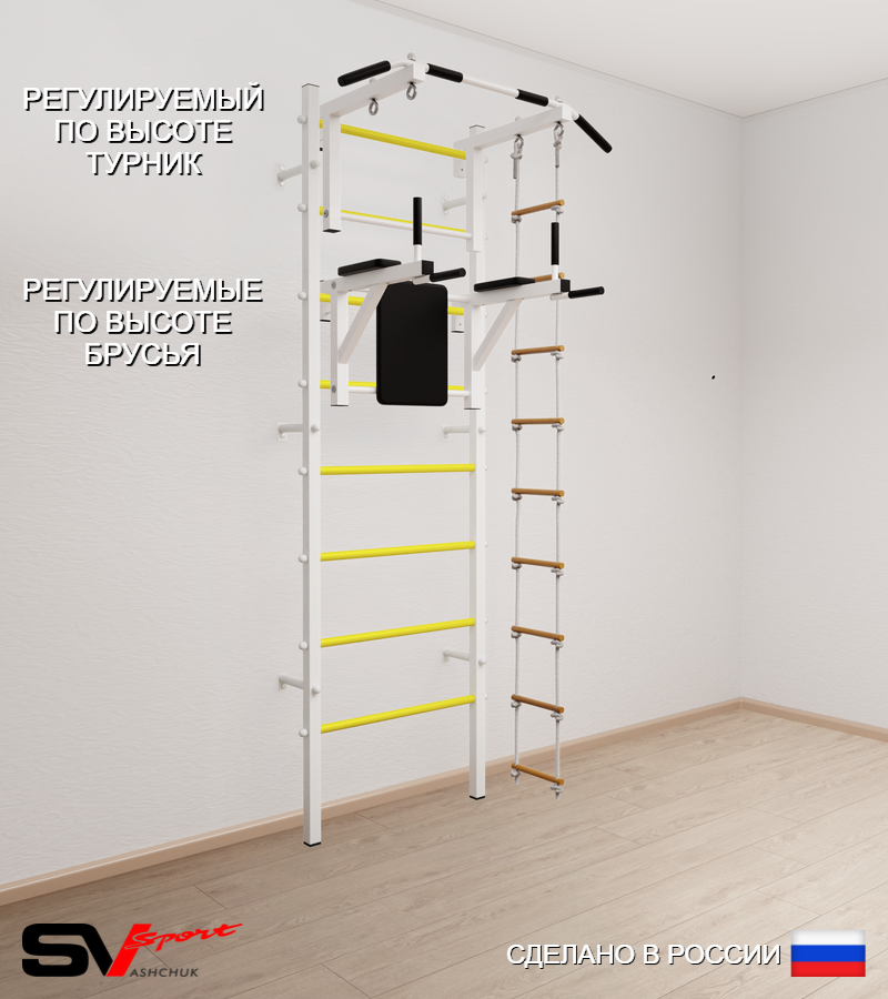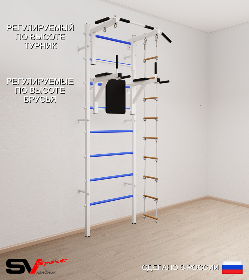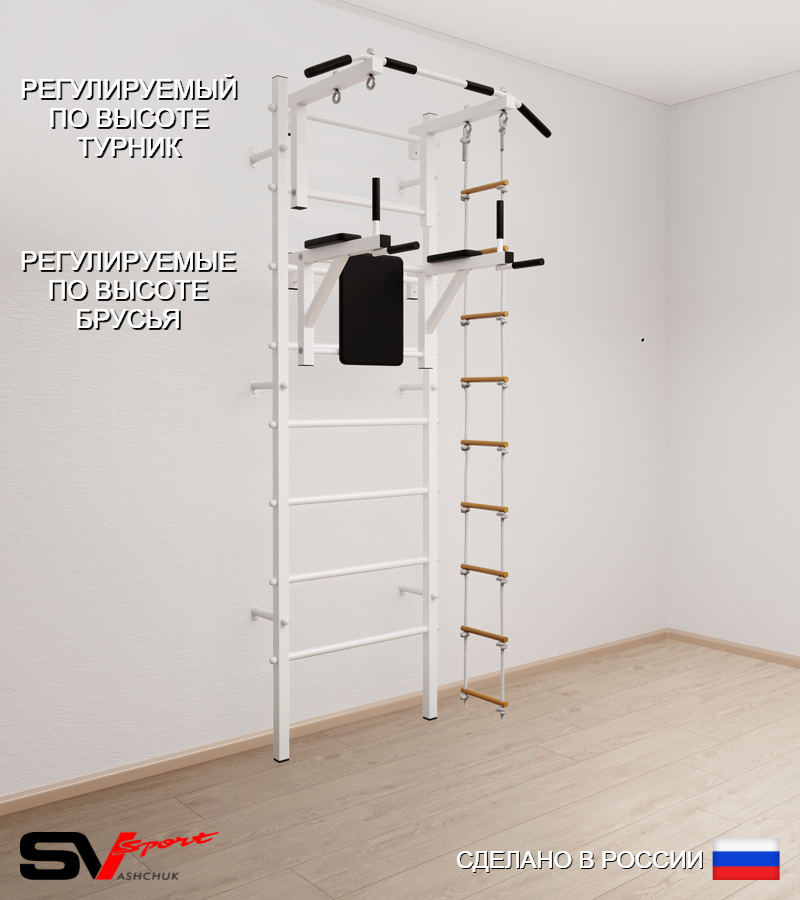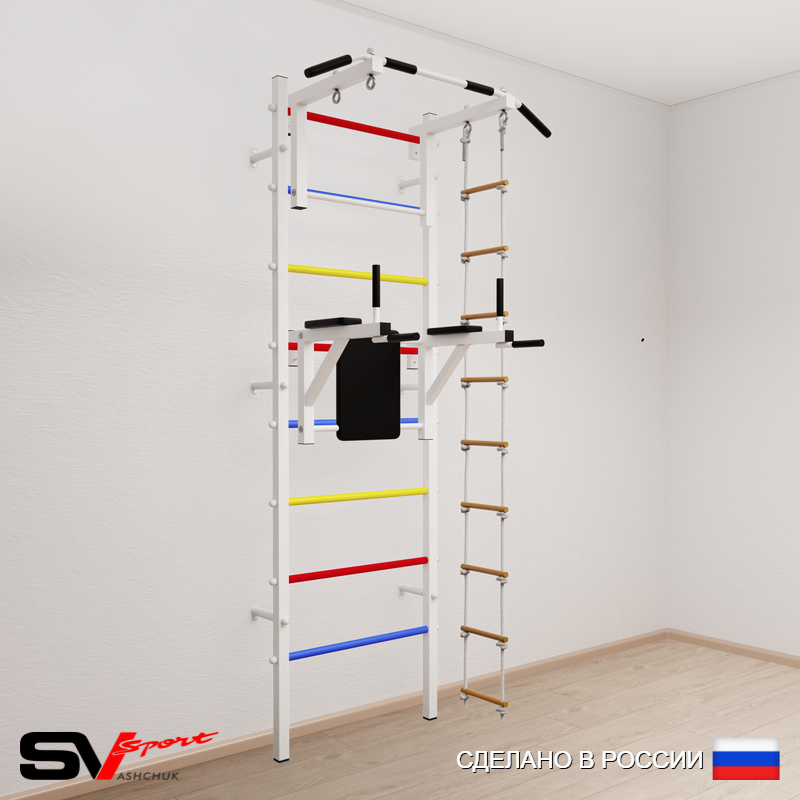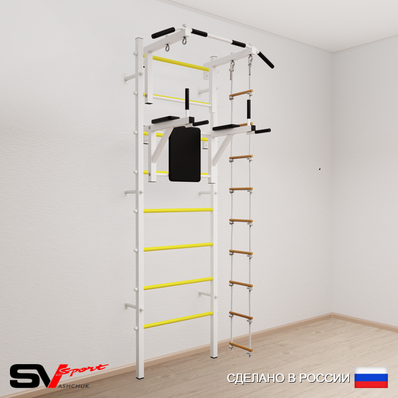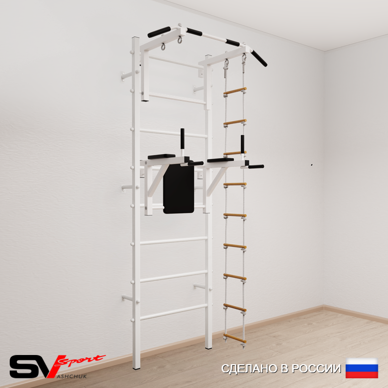 КОМПЛЕКТАЦИЯ: Шведская стенка Sv Sport усиленная (профиль вертикальных стоек 60 х 40 х 2 мм), Турник Sv Sport стандарт к ШС, Брусья Sv Sport к ШС, Лестница веревочная.