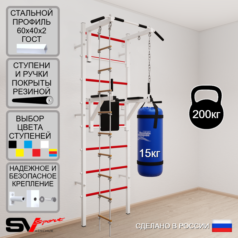 КОМПЛЕКТАЦИЯ: Шведская стенка Sv Sport усиленная (профиль вертикальных стоек 60 х 40 х 2 мм), Турник Sv Sport стандарт к ШС, Брусья Sv Sport к ШС, Лестница веревочная, Цепь удлинитель 90см, Мешок боксерский 15кг.