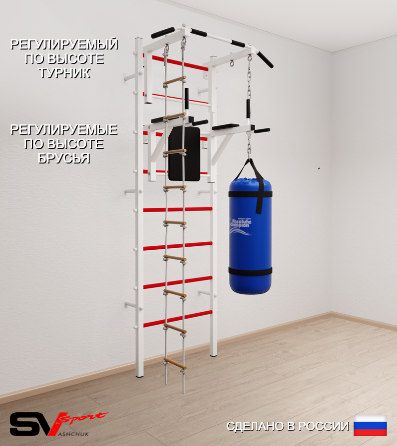 КОМПЛЕКТАЦИЯ: Шведская стенка Sv Sport усиленная (профиль вертикальных стоек 60 х 40 х 2 мм), Турник Sv Sport стандарт к ШС, Брусья Sv Sport к ШС, Лестница веревочная, Цепь удлинитель 90см, Мешок боксерский 22кг.