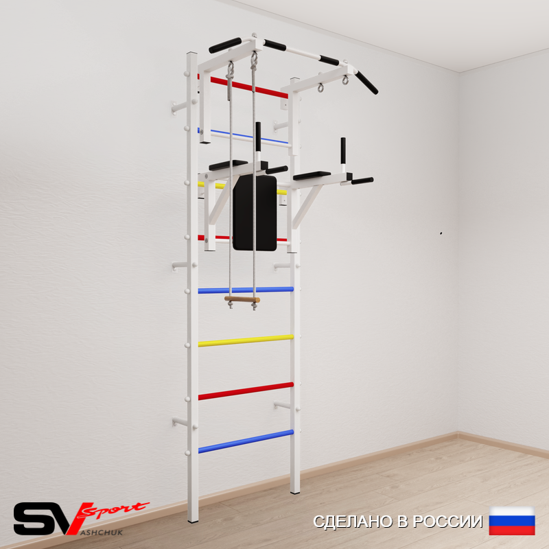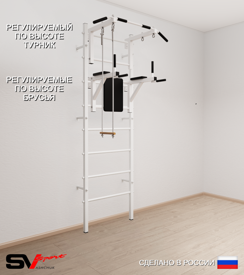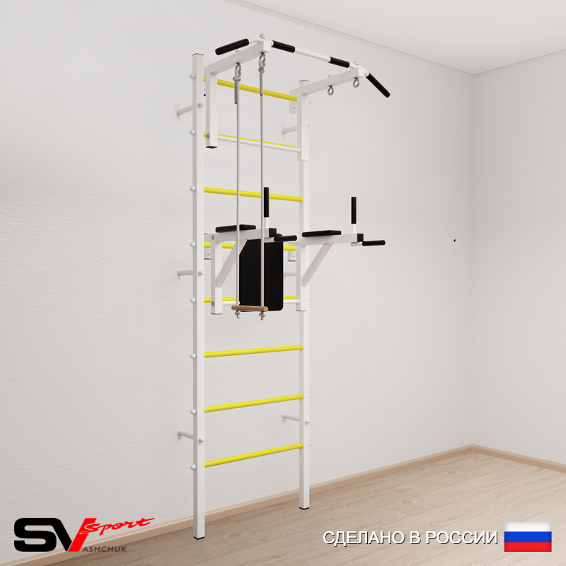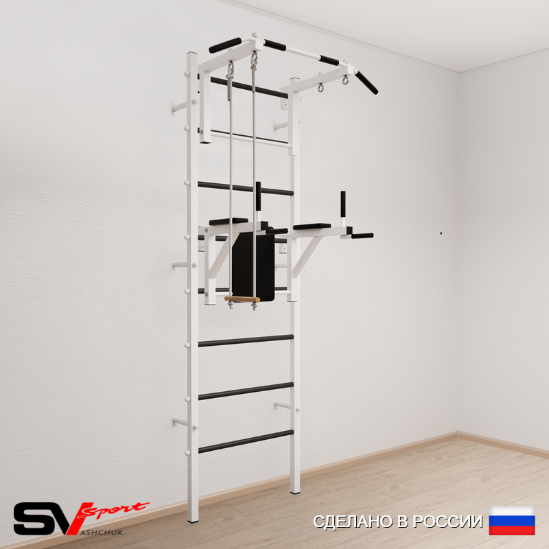 КОМПЛЕКТАЦИЯ: Шведская стенка Sv Sport усиленная (профиль вертикальных стоек 60 х 40 х 2 мм), Турник Sv Sport стандарт к ШС, Брусья Sv Sport к ШС, Трапеция.