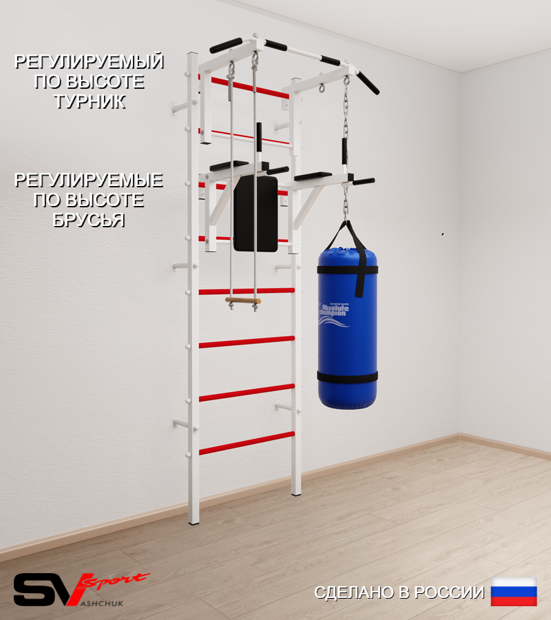 КОМПЛЕКТАЦИЯ: Шведская стенка Sv Sport усиленная (профиль вертикальных стоек 60 х 40 х 2 мм), Турник Sv Sport стандарт к ШС, Брусья Sv Sport к ШС, Трапеция, Цепь удлинитель 90см, Мешок боксерский 15кг.