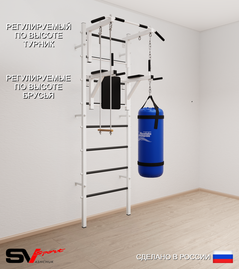 КОМПЛЕКТАЦИЯ: Шведская стенка Sv Sport усиленная (профиль вертикальных стоек 60 х 40 х 2 мм), Турник Sv Sport стандарт к ШС, Брусья Sv Sport к ШС, Трапеция, Цепь удлинитель 90см, Мешок боксерский 30кг.