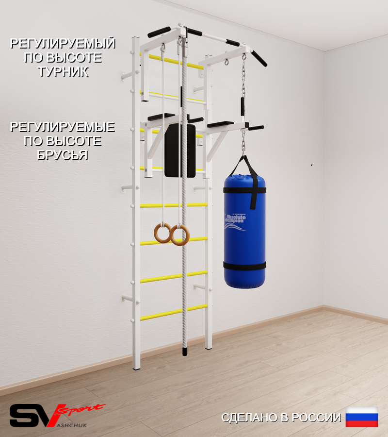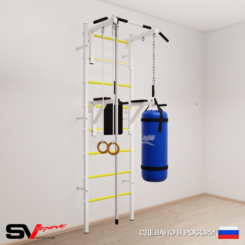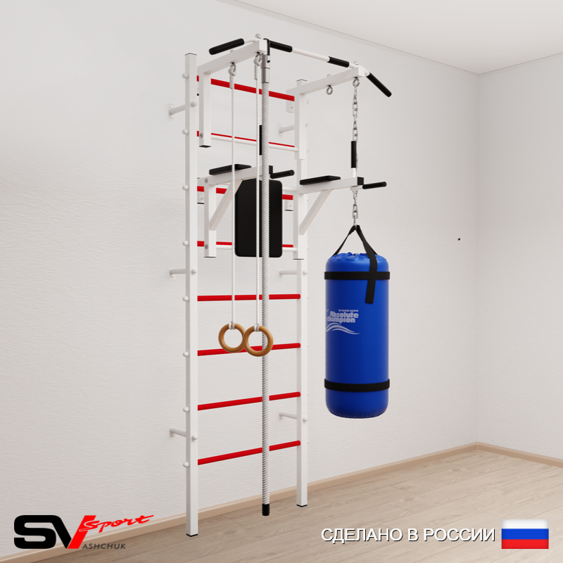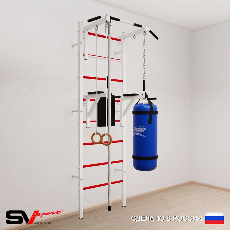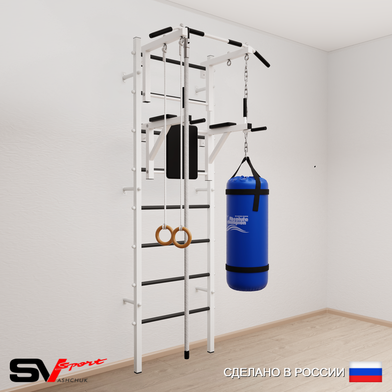 КОМПЛЕКТАЦИЯ: Шведская стенка Sv Sport усиленная (профиль вертикальных стоек 60 х 40 х 2 мм), Турник Sv Sport стандарт к ШС, Брусья Sv Sport к ШС, Kанат, Kольца деревянные, Цепь удлинитель 90см, Мешок боксерский 15кг.