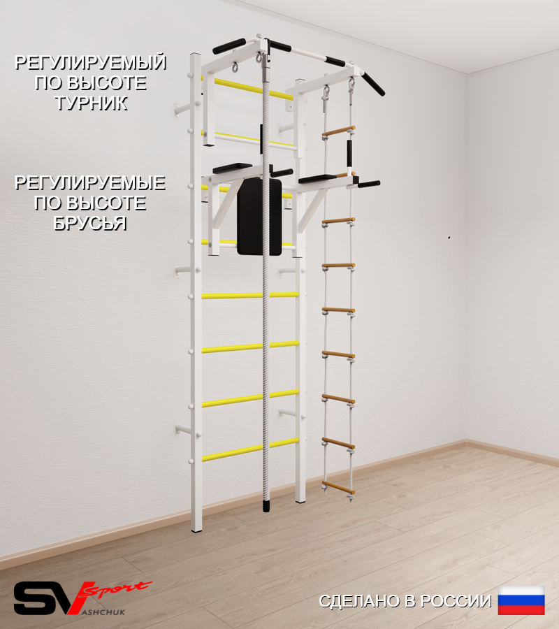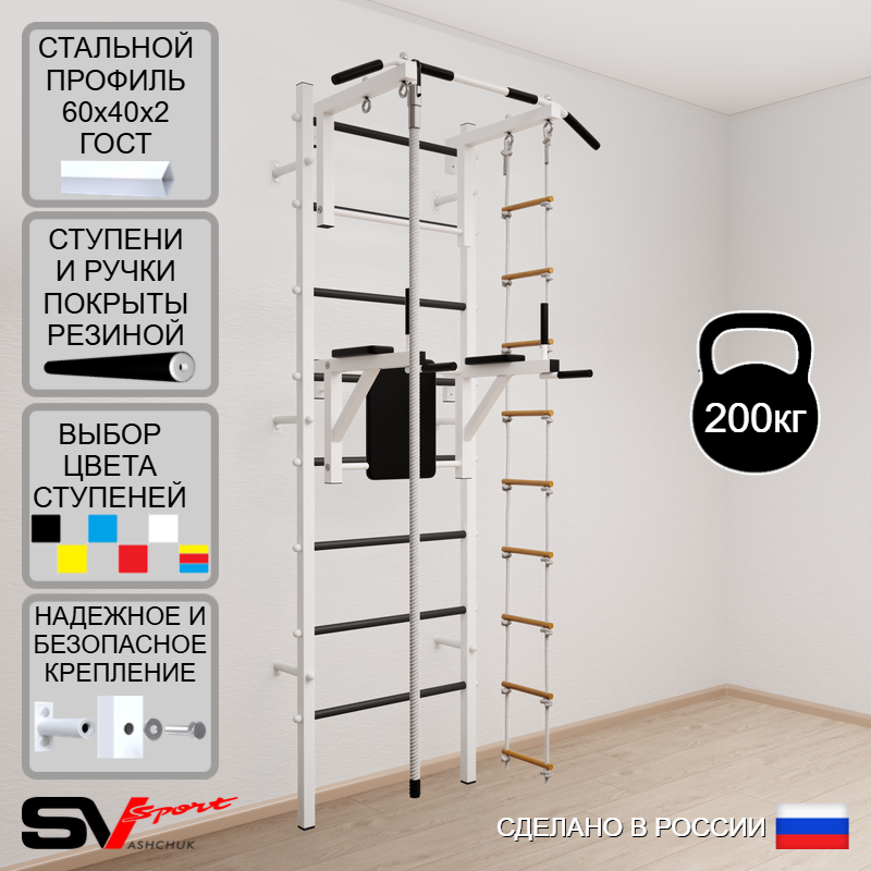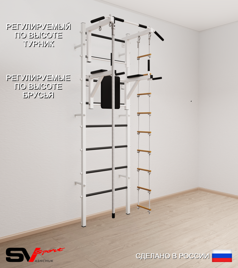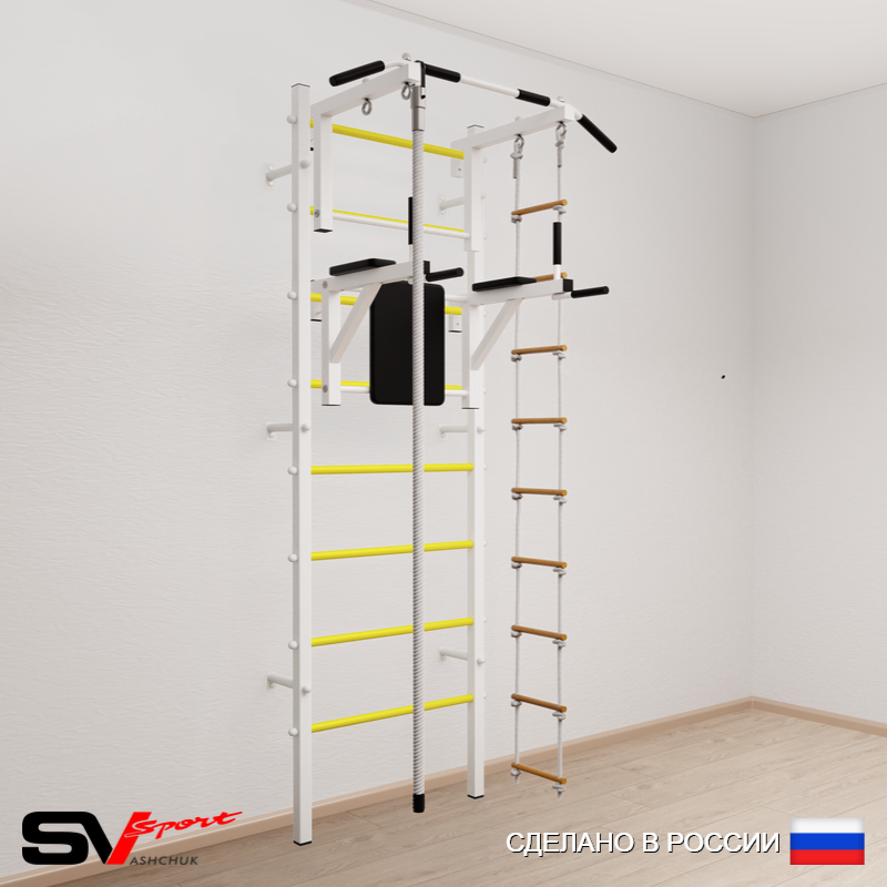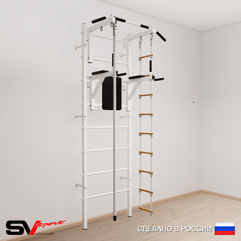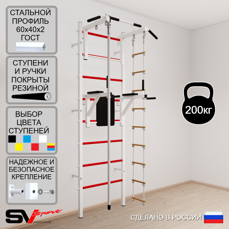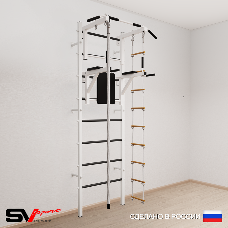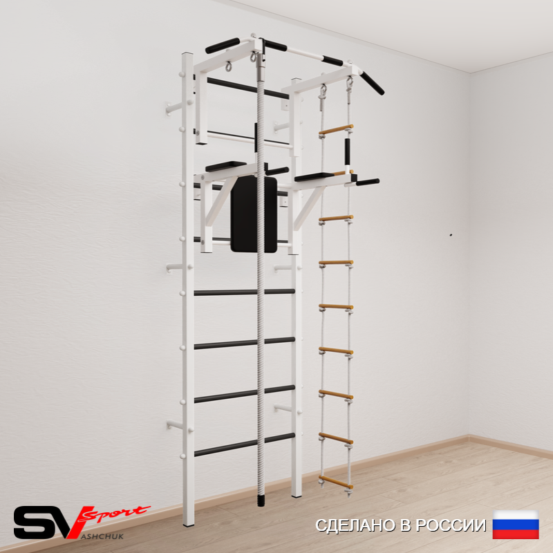 КОМПЛЕКТАЦИЯ: Шведская стенка Sv Sport усиленная (профиль вертикальных стоек 60 х 40 х 2 мм), Турник Sv Sport стандарт к ШС, Брусья Sv Sport к ШС, Kанат, Лестница веревочная.