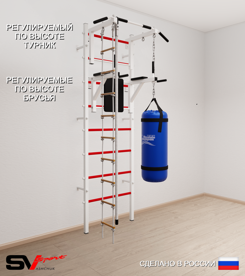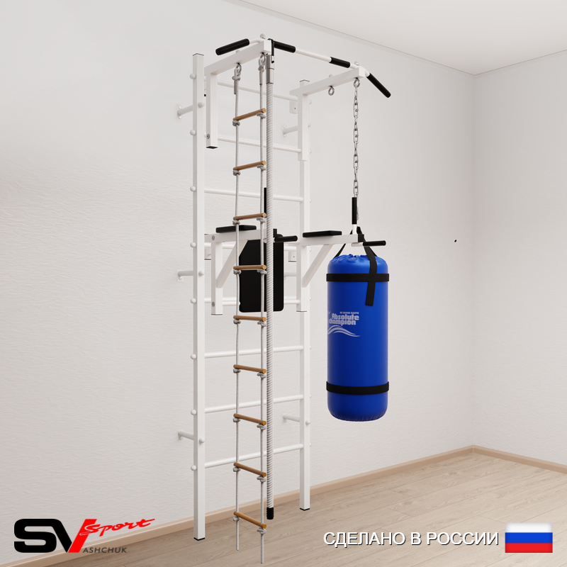 КОМПЛЕКТАЦИЯ: Шведская стенка Sv Sport усиленная (профиль вертикальных стоек 60 х 40 х 2 мм), Турник Sv Sport стандарт к ШС, Брусья Sv Sport к ШС, Kанат, Лестница веревочная, Цепь удлинитель 90см, Мешок боксерский 15кг.