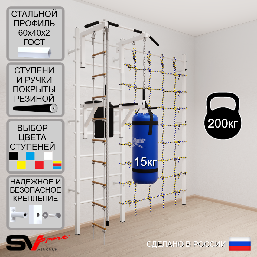 КОМПЛЕКТАЦИЯ: Шведская стенка Sv Sport усиленная (профиль вертикальных стоек 60 х 40 х 2 мм), Турник Sv Sport стандарт к ШС, Брусья Sv Sport к ШС, Kанат, Лестница веревочная, Цепь удлинитель 90см, Мешок боксерский 15кг, Канатный лаз.