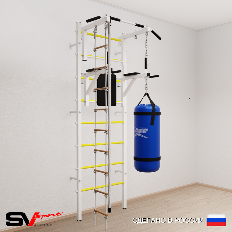 КОМПЛЕКТАЦИЯ: Шведская стенка Sv Sport усиленная (профиль вертикальных стоек 60 х 40 х 2 мм), Турник Sv Sport стандарт к ШС, Брусья Sv Sport к ШС, Kанат, Лестница веревочная, Цепь удлинитель 90см, Мешок боксерский 22кг.