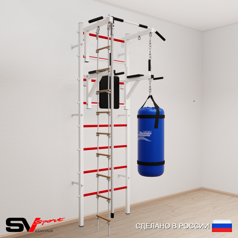 КОМПЛЕКТАЦИЯ: Шведская стенка Sv Sport усиленная (профиль вертикальных стоек 60 х 40 х 2 мм), Турник Sv Sport стандарт к ШС, Брусья Sv Sport к ШС, Kанат, Лестница веревочная, Цепь удлинитель 90см, Мешок боксерский 30кг.