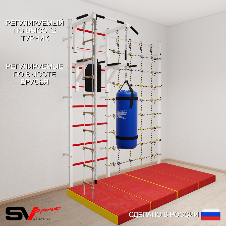 КОМПЛЕКТАЦИЯ: Шведская стенка Sv Sport усиленная (профиль вертикальных стоек 60 х 40 х 2 мм), Турник Sv Sport стандарт к ШС, Брусья Sv Sport к ШС, Kанат, Лестница веревочная, Цепь удлинитель 90см, Мешок боксерский 22кг, Спортивный мат 100 х 200 х 10 см складной, Канатный лаз.