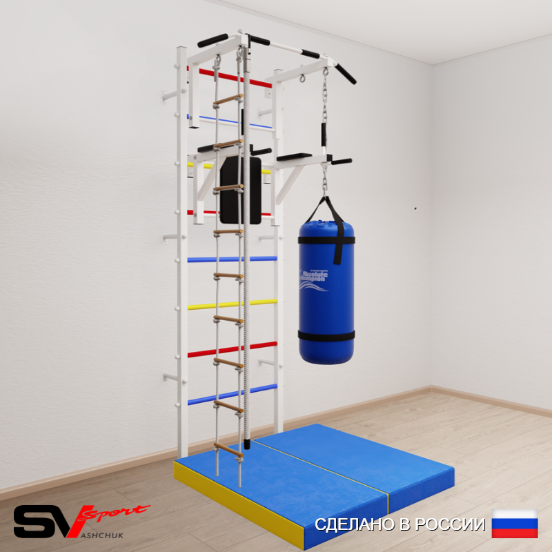 КОМПЛЕКТАЦИЯ: Шведская стенка Sv Sport усиленная (профиль вертикальных стоек 60 х 40 х 2 мм), Турник Sv Sport стандарт к ШС, Брусья Sv Sport к ШС, Kанат, Лестница веревочная, Цепь удлинитель 90см, Мешок боксерский 30кг, Спортивный мат 100 х 100 х 10 см складной.