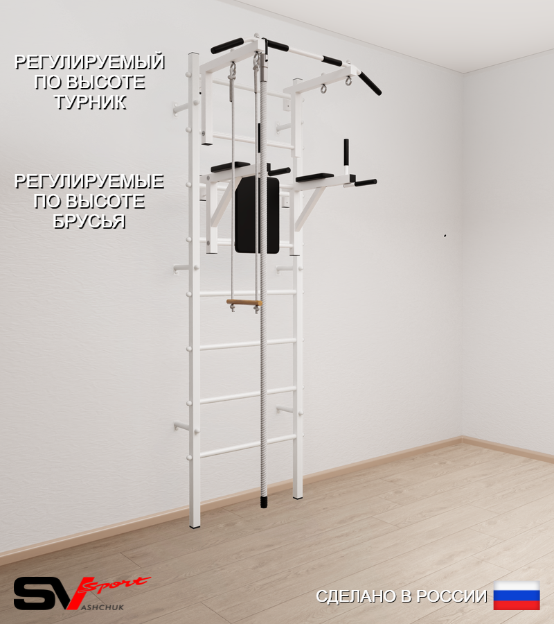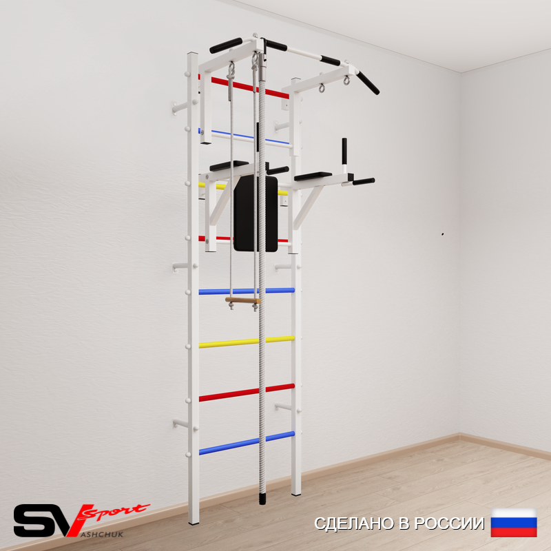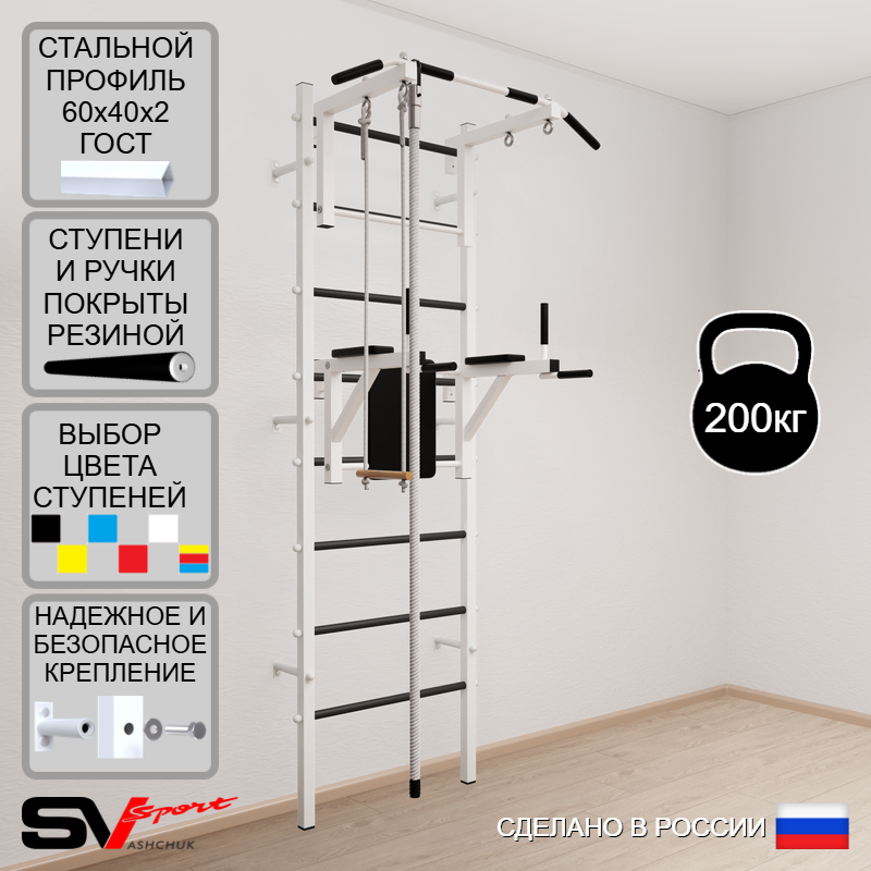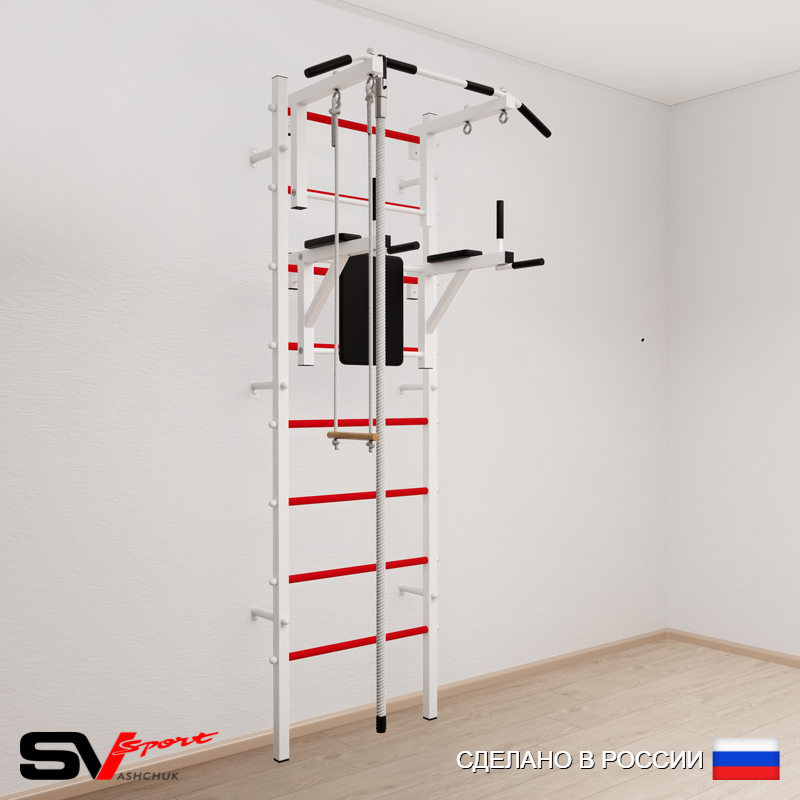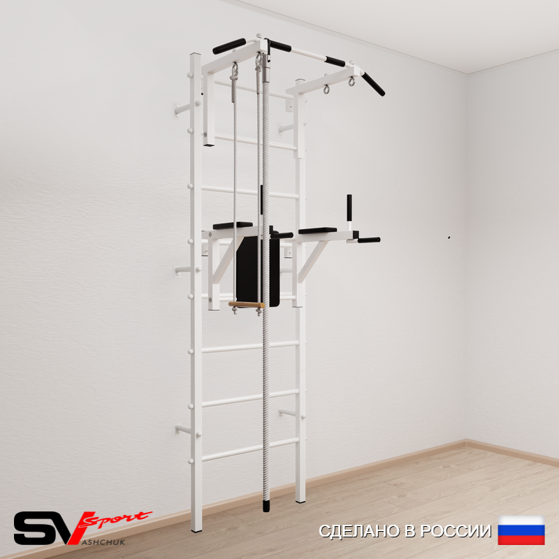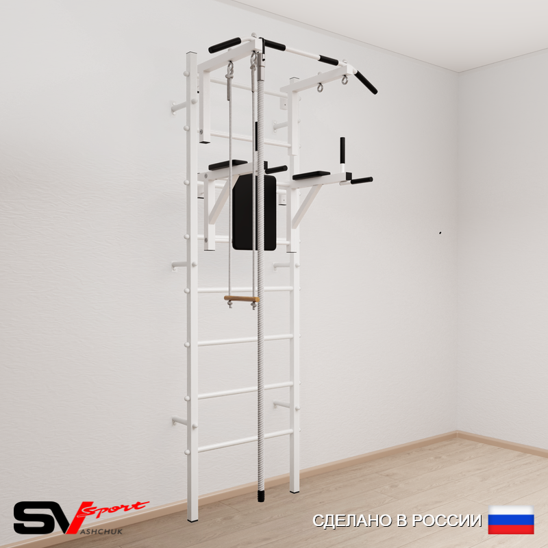 КОМПЛЕКТАЦИЯ: Шведская стенка Sv Sport усиленная (профиль вертикальных стоек 60 х 40 х 2 мм), Турник Sv Sport стандарт к ШС, Брусья Sv Sport к ШС, Kанат, Трапеция.