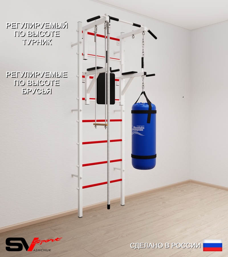 КОМПЛЕКТАЦИЯ: Шведская стенка Sv Sport усиленная (профиль вертикальных стоек 60 х 40 х 2 мм), Турник Sv Sport стандарт к ШС, Брусья Sv Sport к ШС, Kанат, Трапеция, Цепь удлинитель 90см, Мешок боксерский 30кг.