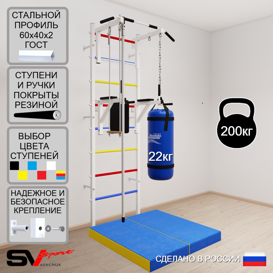 КОМПЛЕКТАЦИЯ: Шведская стенка Sv Sport усиленная (профиль вертикальных стоек 60 х 40 х 2 мм), Турник Sv Sport стандарт к ШС, Брусья Sv Sport к ШС, Kанат, Трапеция, Цепь удлинитель 90см, Мешок боксерский 22кг, Спортивный мат 100 х 100 х 10 см складной.