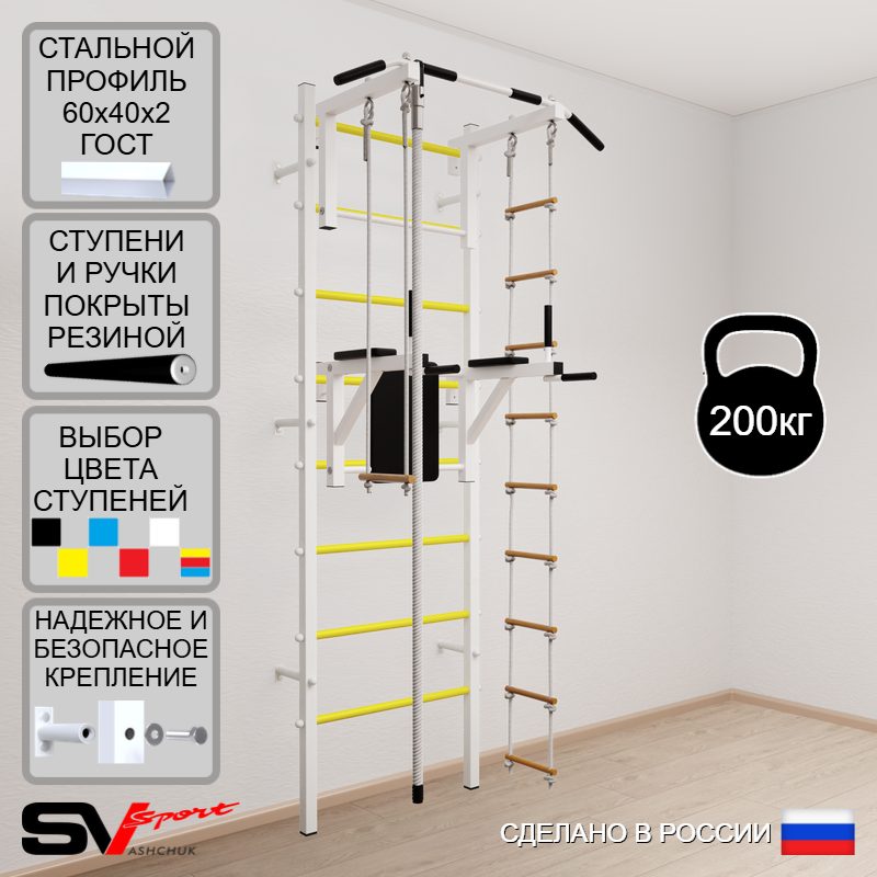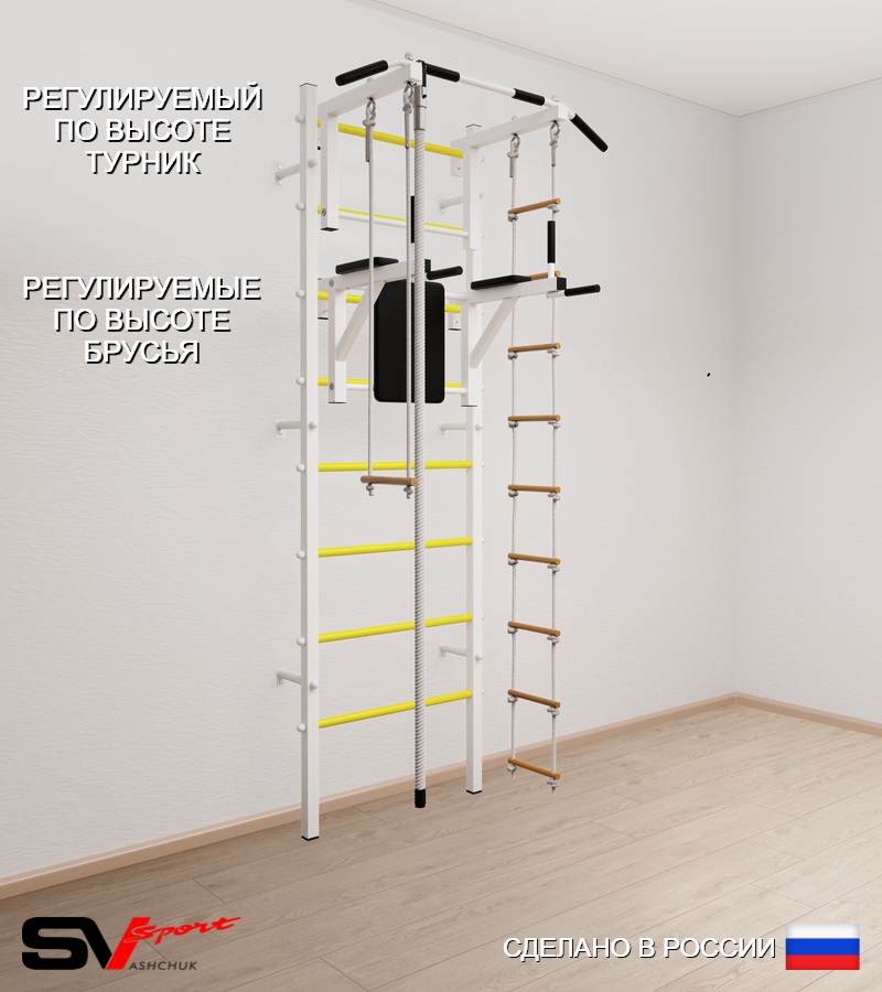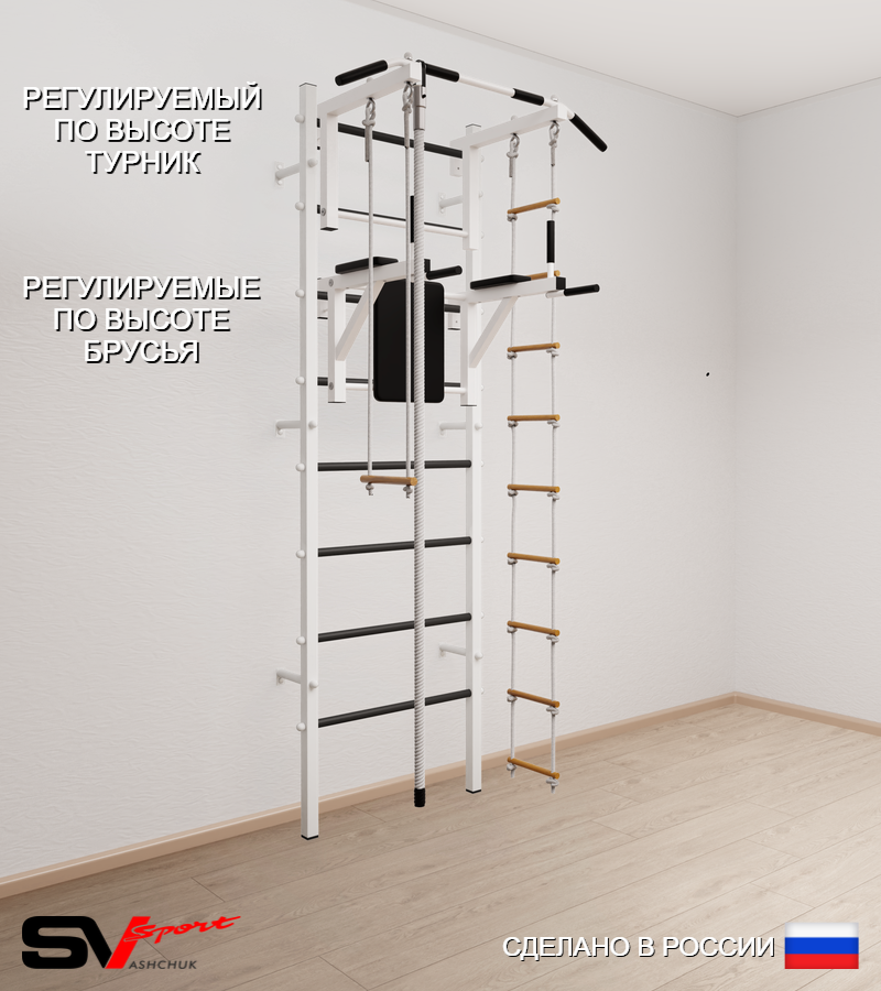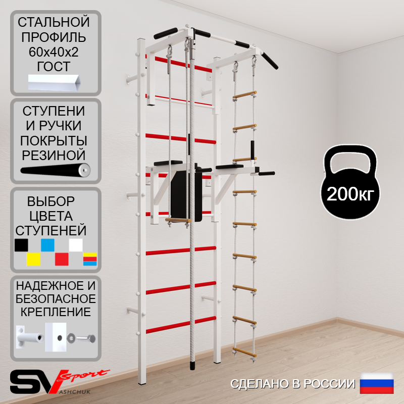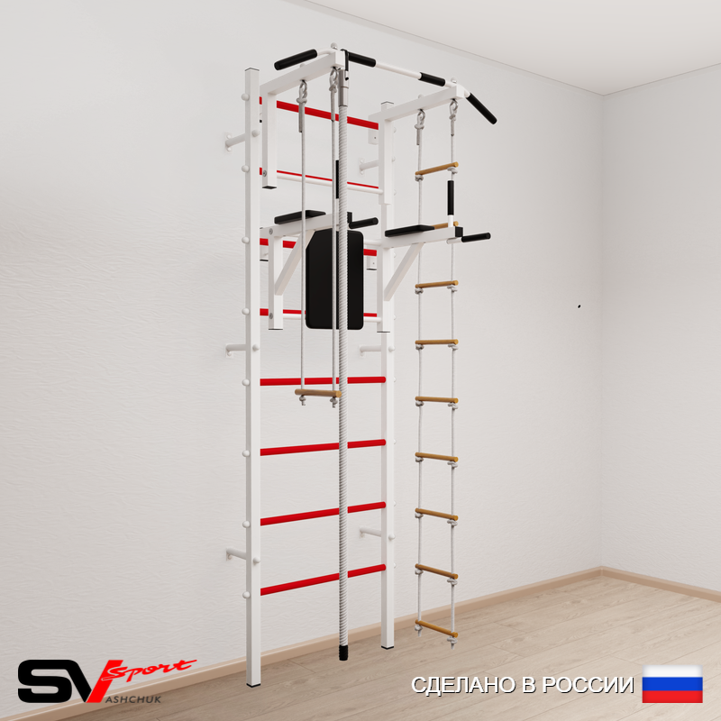 КОМПЛЕКТАЦИЯ: Шведская стенка Sv Sport усиленная (профиль вертикальных стоек 60 х 40 х 2 мм), Турник Sv Sport стандарт к ШС, Брусья Sv Sport к ШС, Kанат, Трапеция, Лестница веревочная.