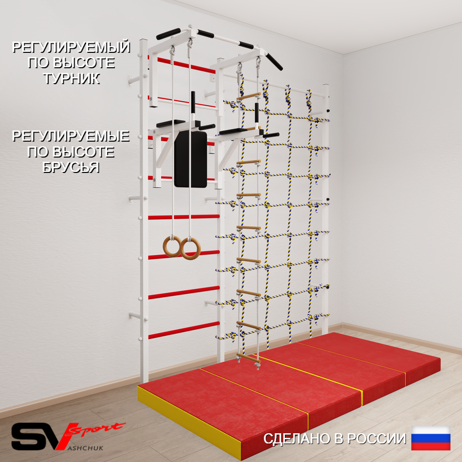 КОМПЛЕКТАЦИЯ: Шведская стенка Sv Sport усиленная (профиль вертикальных стоек 60 х 40 х 2 мм), Турник Sv Sport стандарт к ШС, Брусья Sv Sport к ШС, Kольца деревянные, Лестница веревочная, Спортивный мат 100 х 200 х 10 см складной, Канатный лаз.