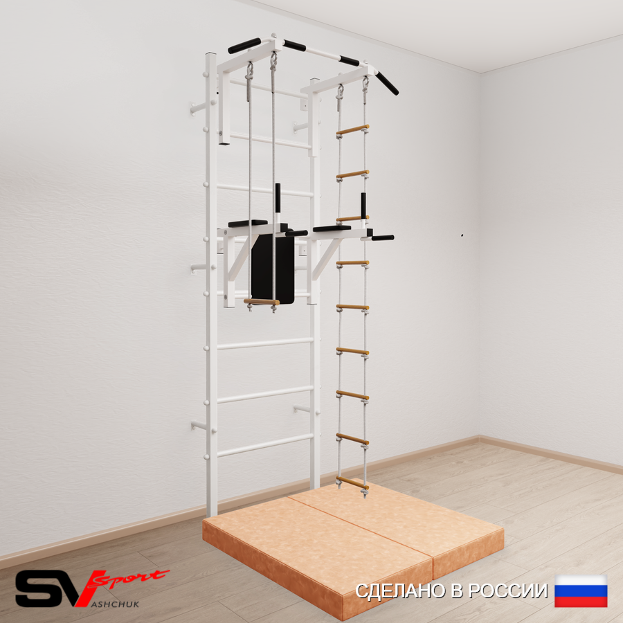КОМПЛЕКТАЦИЯ: Шведская стенка Sv Sport усиленная (профиль вертикальных стоек 60 х 40 х 2 мм), Турник Sv Sport стандарт к ШС, Брусья Sv Sport к ШС, Трапеция, Лестница веревочная, Спортивный мат 100 х 100 х 10 см складной.