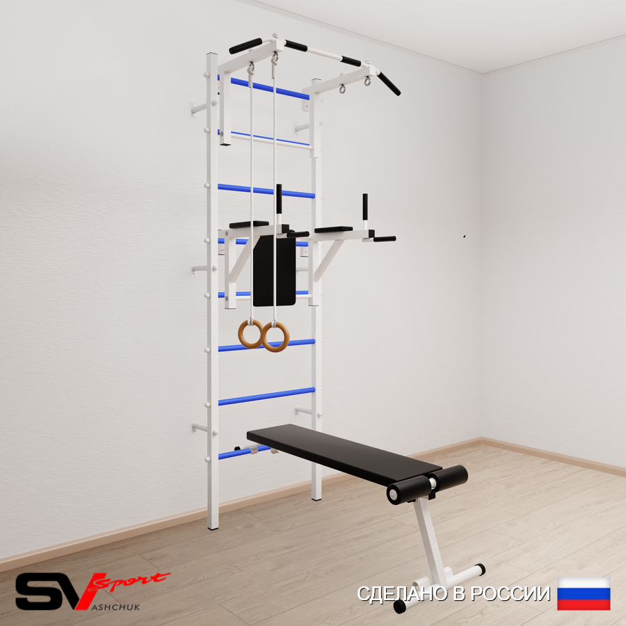 КОМПЛЕКТАЦИЯ: Шведская стенка Sv Sport усиленная (профиль вертикальных стоек 60 х 40 х 2 мм), Турник Sv Sport стандарт к ШС, Брусья Sv Sport к ШС, Скамья для пресса и жима Sv Sport к ШС, Kольца деревянные.