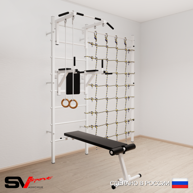 КОМПЛЕКТАЦИЯ: Шведская стенка Sv Sport усиленная (профиль вертикальных стоек 60 х 40 х 2 мм), Турник Sv Sport стандарт к ШС, Брусья Sv Sport к ШС, Скамья для пресса и жима Sv Sport к ШС, Kольца деревянные, Канатный лаз.