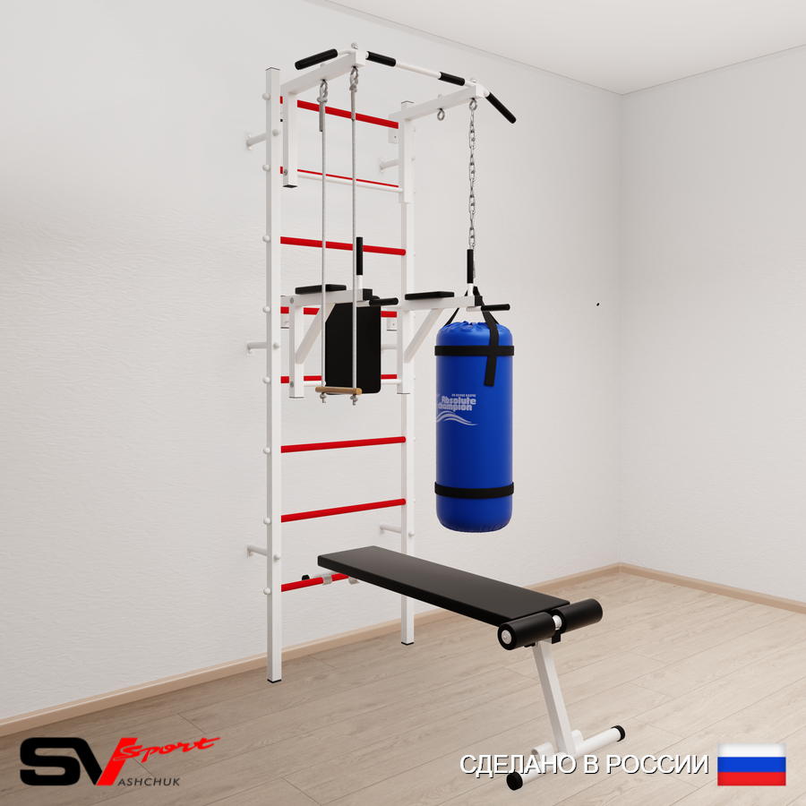 КОМПЛЕКТАЦИЯ: Шведская стенка Sv Sport усиленная (профиль вертикальных стоек 60 х 40 х 2 мм), Турник Sv Sport стандарт к ШС, Брусья Sv Sport к ШС, Скамья для пресса и жима Sv Sport к ШС, Трапеция, Цепь удлинитель 90см, Мешок боксерский 30кг.