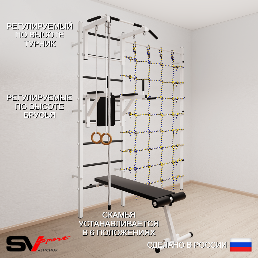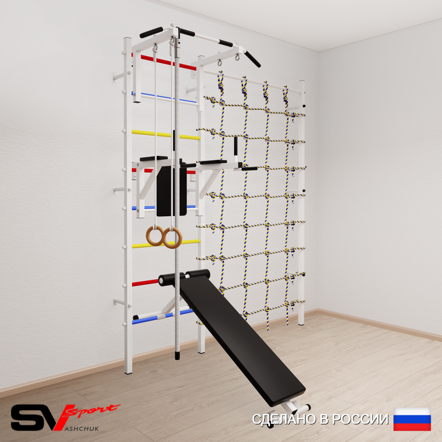 КОМПЛЕКТАЦИЯ: Шведская стенка Sv Sport усиленная (профиль вертикальных стоек 60 х 40 х 2 мм), Турник Sv Sport стандарт к ШС, Брусья Sv Sport к ШС, Скамья для пресса и жима Sv Sport к ШС, Kанат, Kольца деревянные, Канатный лаз.