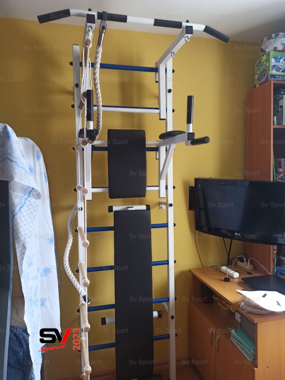 КОМПЛЕКТАЦИЯ: Шведская стенка Sv Sport усиленная (профиль вертикальных стоек 60 х 40 х 2 мм), Турник Sv Sport стандарт к ШС, Брусья Sv Sport к ШС, Скамья для пресса и жима Sv Sport к ШС, Kанат, Лестница веревочная.