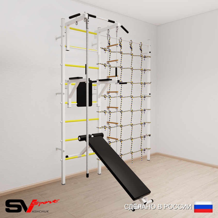 КОМПЛЕКТАЦИЯ: Шведская стенка Sv Sport усиленная (профиль вертикальных стоек 60 х 40 х 2 мм), Турник Sv Sport стандарт к ШС, Брусья Sv Sport к ШС, Скамья для пресса и жима Sv Sport к ШС, Kанат, Лестница веревочная, Канатный лаз.