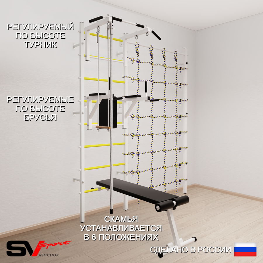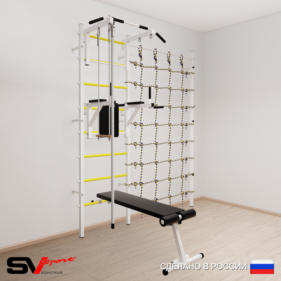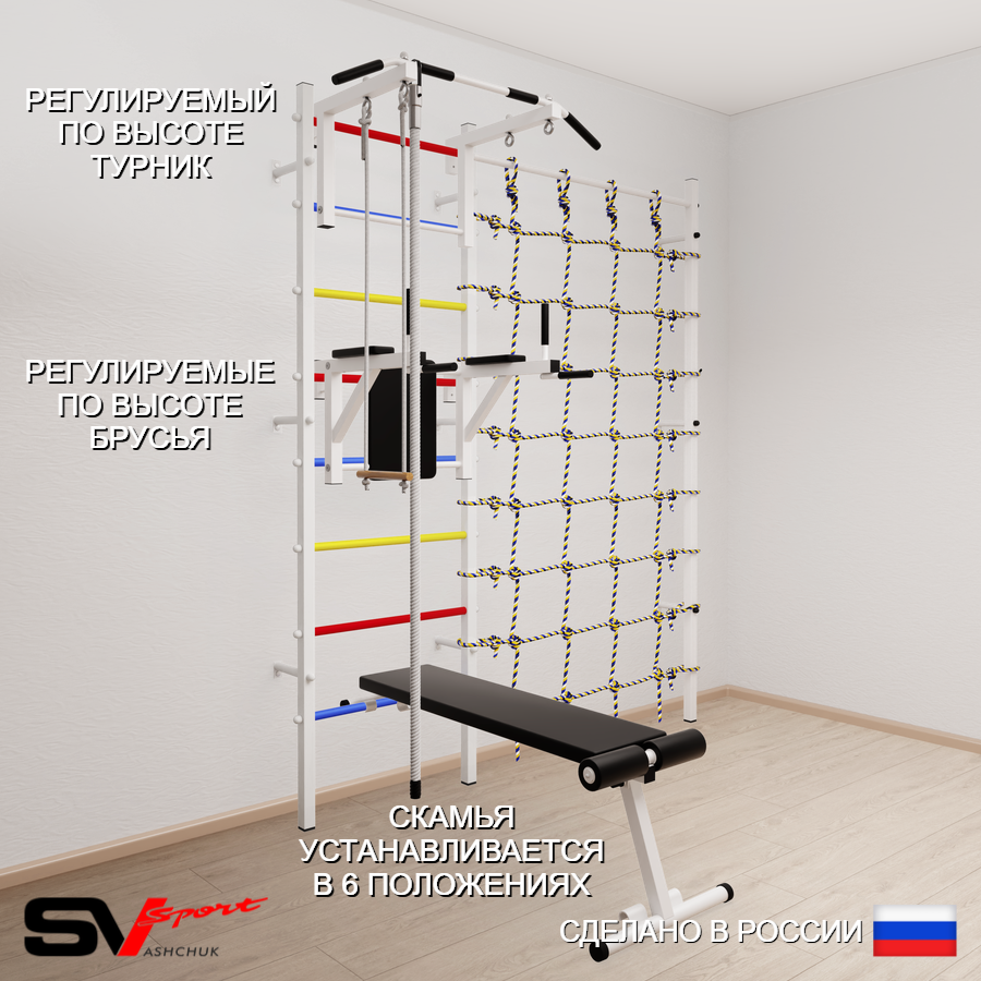 КОМПЛЕКТАЦИЯ: Шведская стенка Sv Sport усиленная (профиль вертикальных стоек 60 х 40 х 2 мм), Турник Sv Sport стандарт к ШС, Брусья Sv Sport к ШС, Скамья для пресса и жима Sv Sport к ШС, Kанат, Трапеция, Канатный лаз.