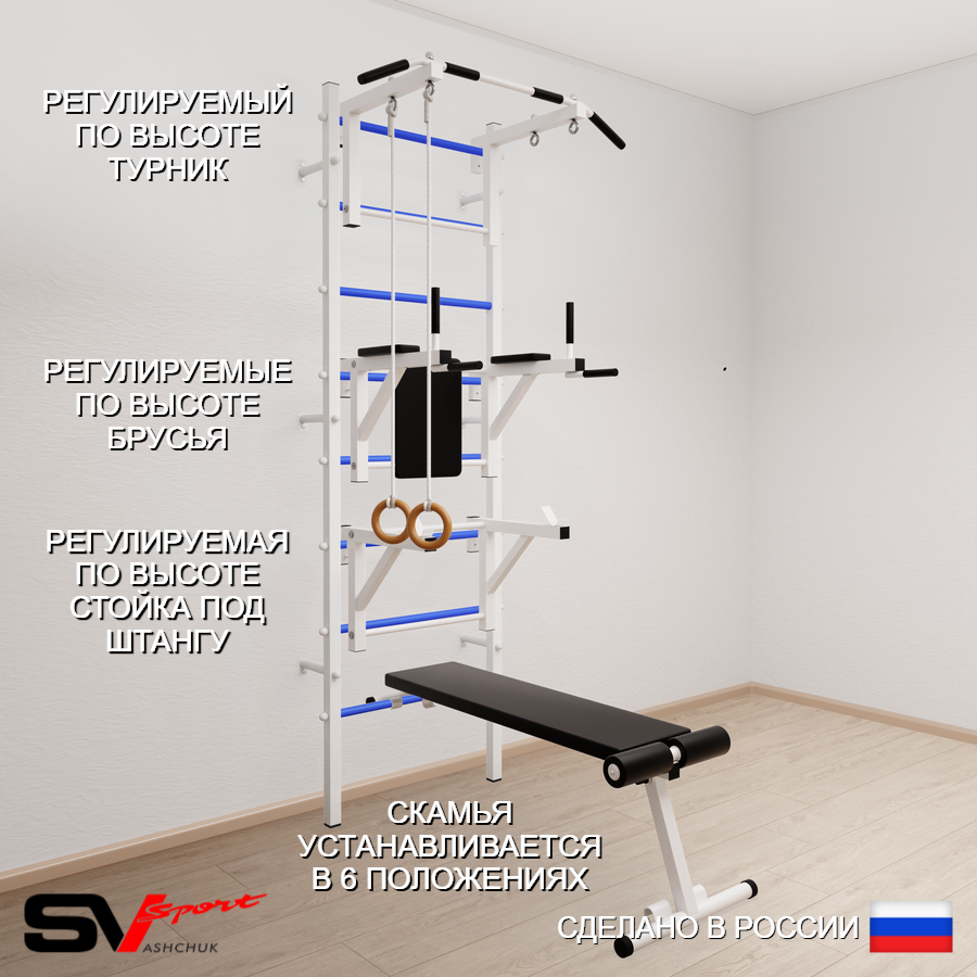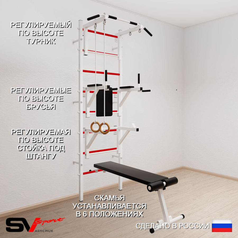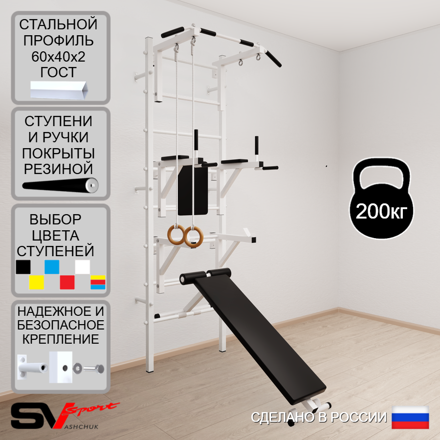 КОМПЛЕКТАЦИЯ: Шведская стенка Sv Sport усиленная (профиль вертикальных стоек 60 х 40 х 2 мм), Турник Sv Sport стандарт к ШС, Брусья Sv Sport к ШС, Стойка под штангу Sv Sport к ШС, Скамья для пресса и жима Sv Sport к ШС, Kольца деревянные.