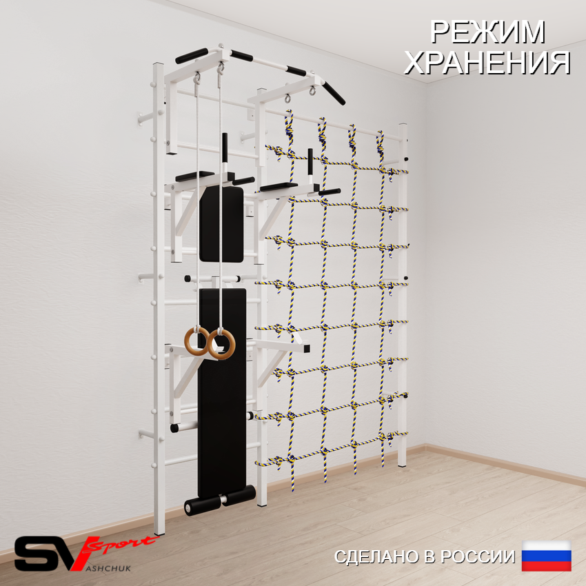 КОМПЛЕКТАЦИЯ: Шведская стенка Sv Sport усиленная (профиль вертикальных стоек 60 х 40 х 2 мм), Турник Sv Sport стандарт к ШС, Брусья Sv Sport к ШС, Стойка под штангу Sv Sport к ШС, Скамья для пресса и жима Sv Sport к ШС, Kольца деревянные, Канатный лаз.