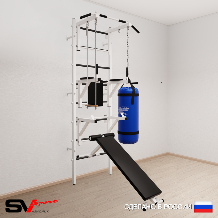 КОМПЛЕКТАЦИЯ: Шведская стенка Sv Sport усиленная (профиль вертикальных стоек 60 х 40 х 2 мм), Турник Sv Sport стандарт к ШС, Брусья Sv Sport к ШС, Стойка под штангу Sv Sport к ШС, Скамья для пресса и жима Sv Sport к ШС, Трапеция, Цепь удлинитель 90см, Мешок боксерский 15кг.