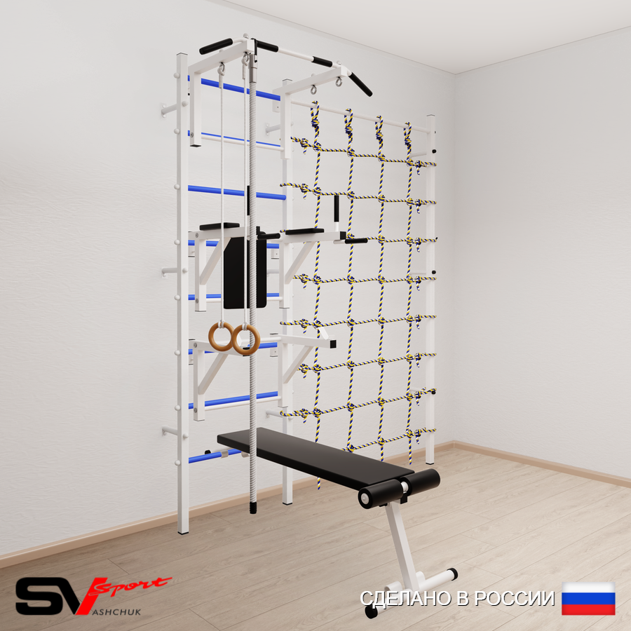 КОМПЛЕКТАЦИЯ: Шведская стенка Sv Sport усиленная (профиль вертикальных стоек 60 х 40 х 2 мм), Турник Sv Sport стандарт к ШС, Брусья Sv Sport к ШС, Стойка под штангу Sv Sport к ШС, Скамья для пресса и жима Sv Sport к ШС, Kанат, Kольца деревянные, Канатный лаз.