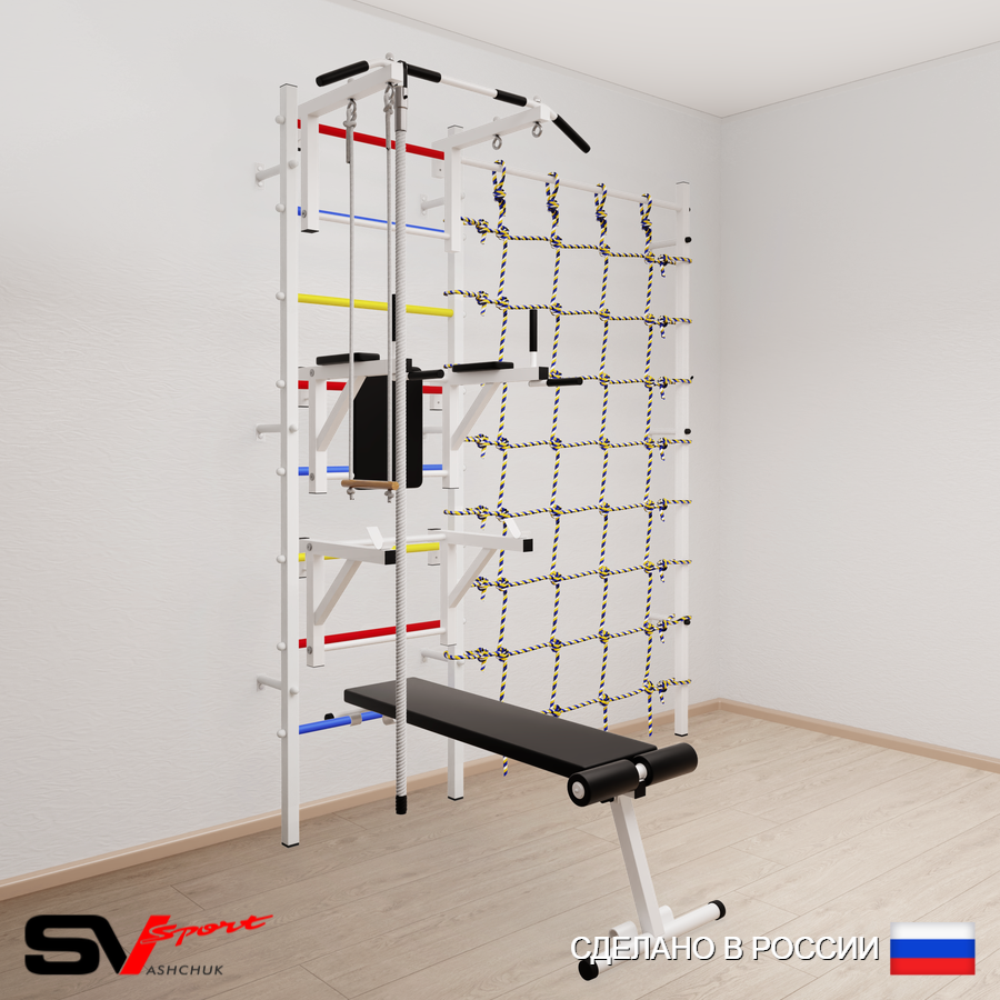 КОМПЛЕКТАЦИЯ: Шведская стенка Sv Sport усиленная (профиль вертикальных стоек 60 х 40 х 2 мм), Турник Sv Sport стандарт к ШС, Брусья Sv Sport к ШС, Стойка под штангу Sv Sport к ШС, Скамья для пресса и жима Sv Sport к ШС, Kанат, Трапеция, Канатный лаз.