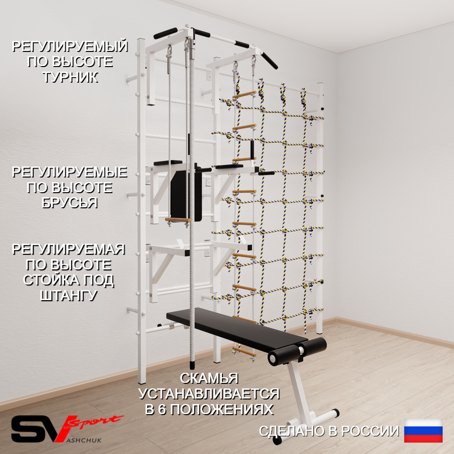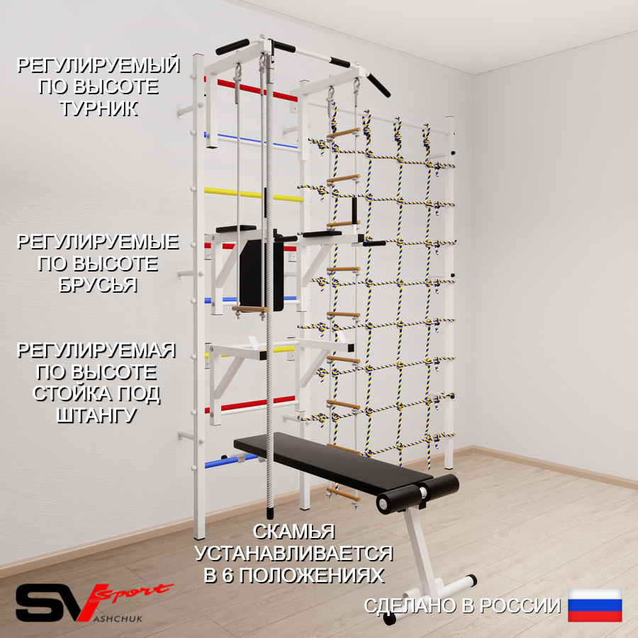 КОМПЛЕКТАЦИЯ: Шведская стенка Sv Sport усиленная (профиль вертикальных стоек 60 х 40 х 2 мм), Турник Sv Sport стандарт к ШС, Брусья Sv Sport к ШС, Стойка под штангу Sv Sport к ШС, Скамья для пресса и жима Sv Sport к ШС, Kанат, Трапеция, Лестница веревочная, Канатный лаз.