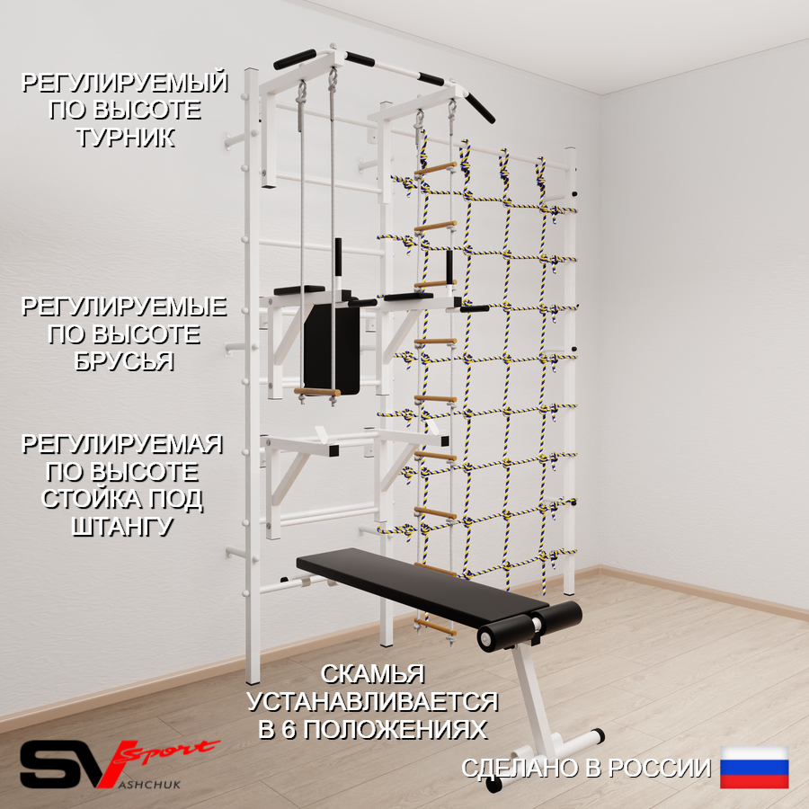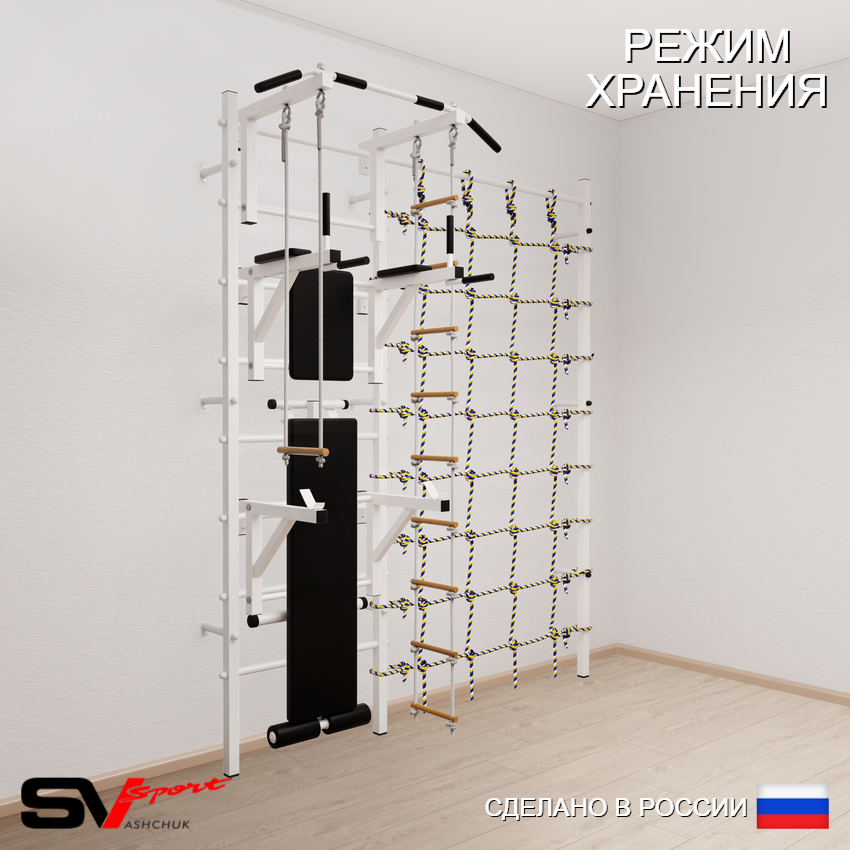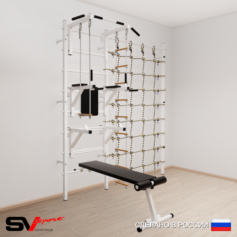 КОМПЛЕКТАЦИЯ: Шведская стенка Sv Sport усиленная (профиль вертикальных стоек 60 х 40 х 2 мм), Турник Sv Sport стандарт к ШС, Брусья Sv Sport к ШС, Стойка под штангу Sv Sport к ШС, Скамья для пресса и жима Sv Sport к ШС, Трапеция, Лестница веревочная, Канатный лаз.