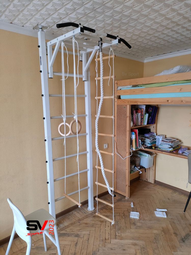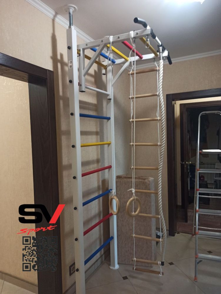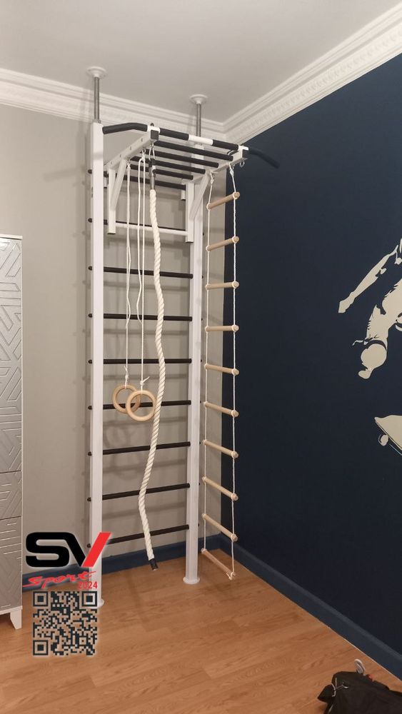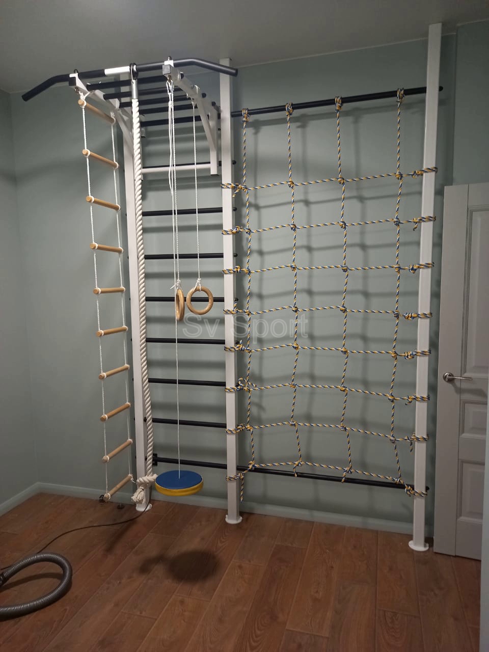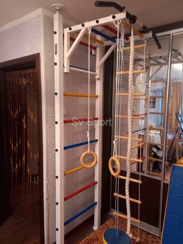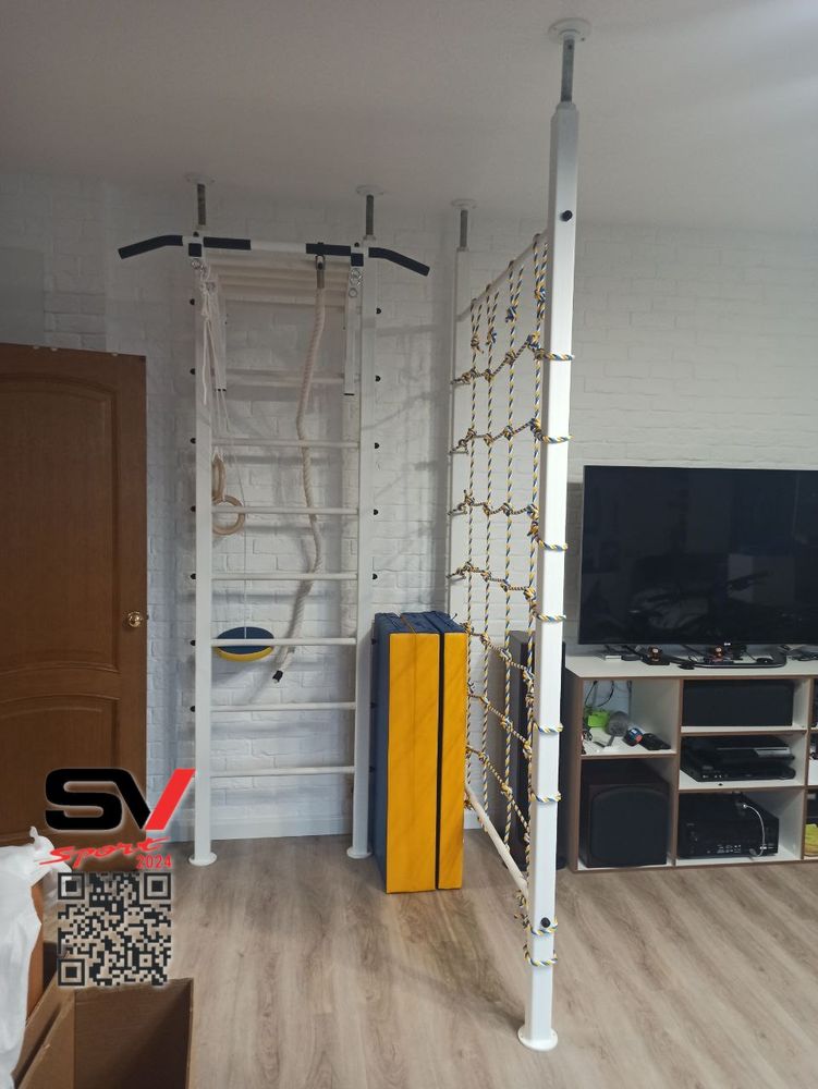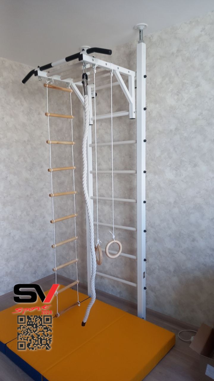 КОМПЛЕКТАЦИЯ: Шведская стенка Sv Sport враспор, Турник Sv Sport рукоход к ШС, Kанат, Kольца деревянные, Лестница веревочная.