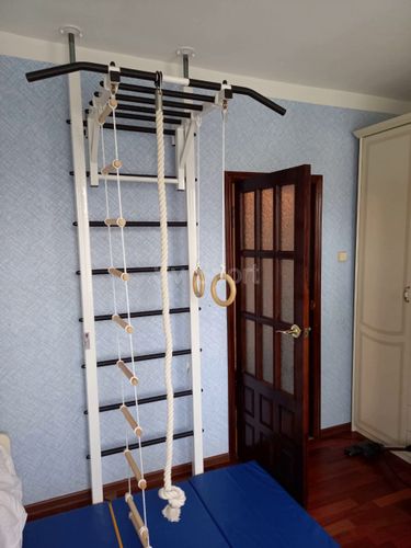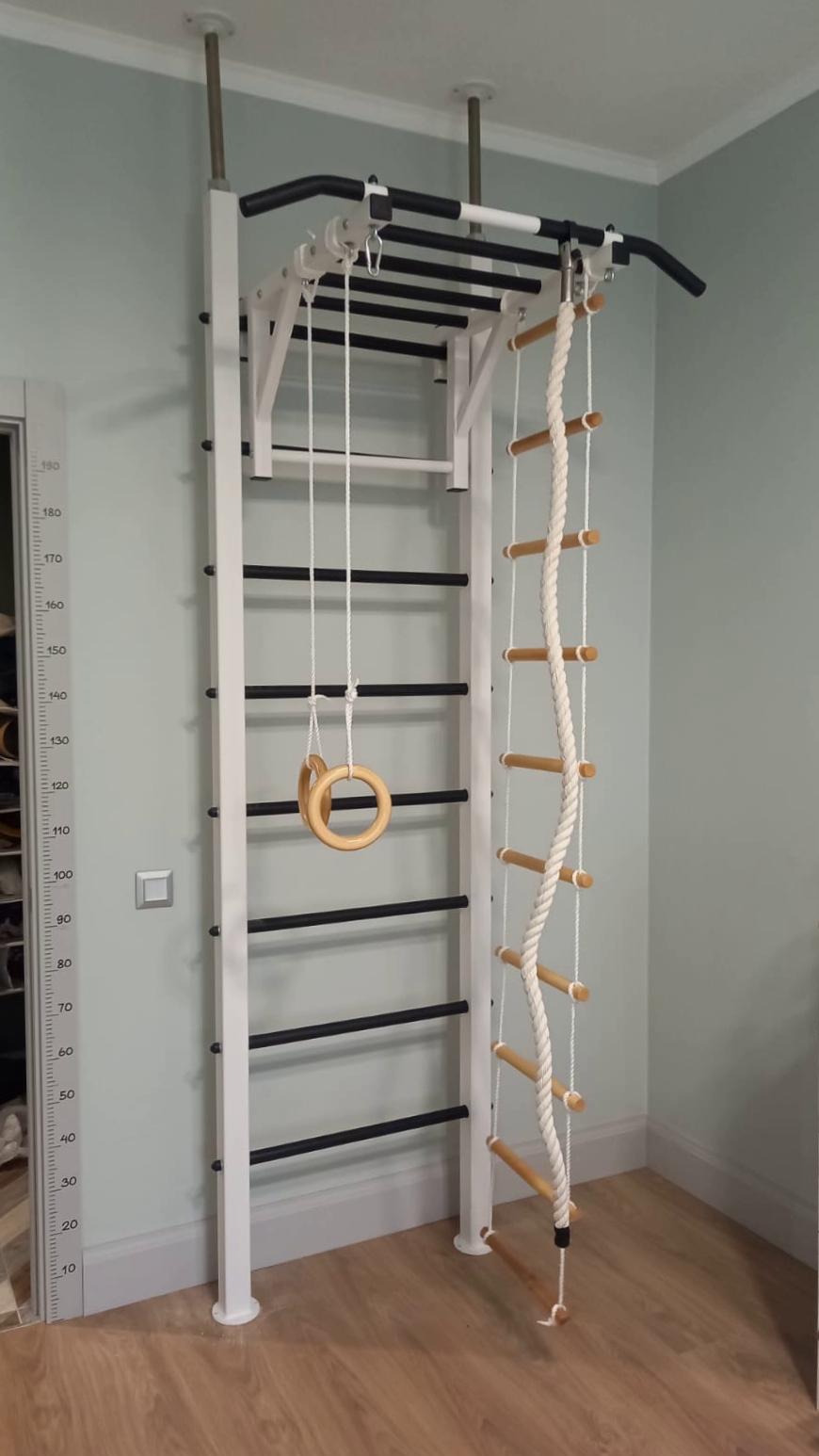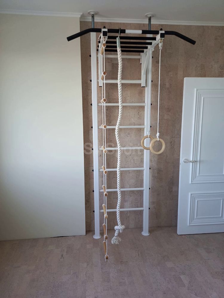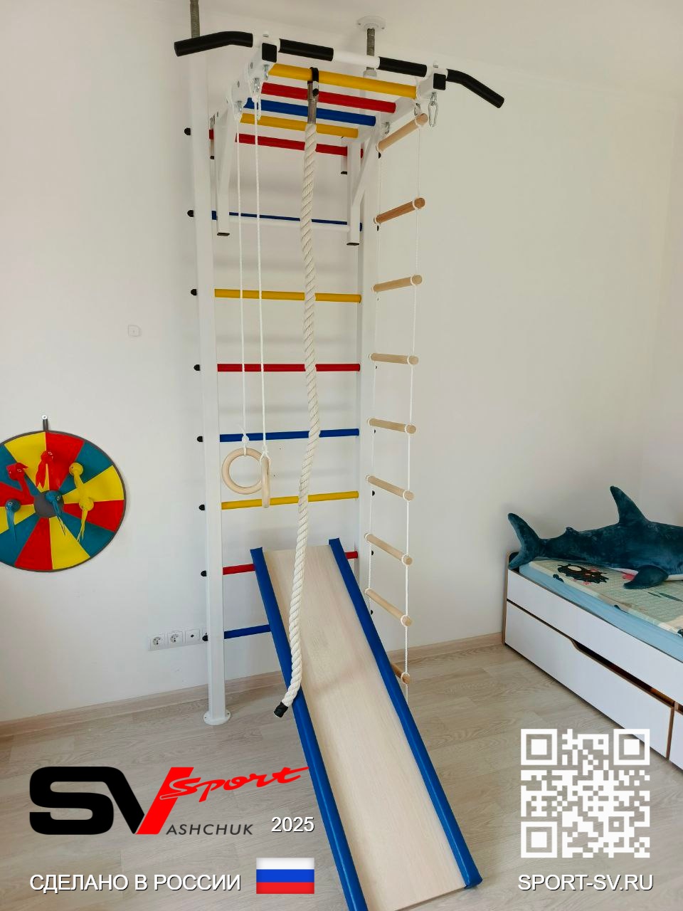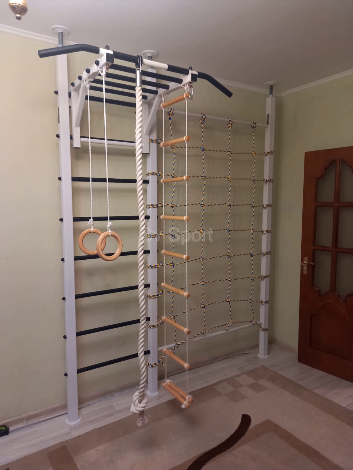 КОМПЛЕКТАЦИЯ: Шведская стенка Sv Sport враспор, Турник Sv Sport рукоход к ШС, Kанат, Kольца деревянные, Лестница веревочная.