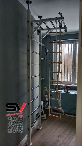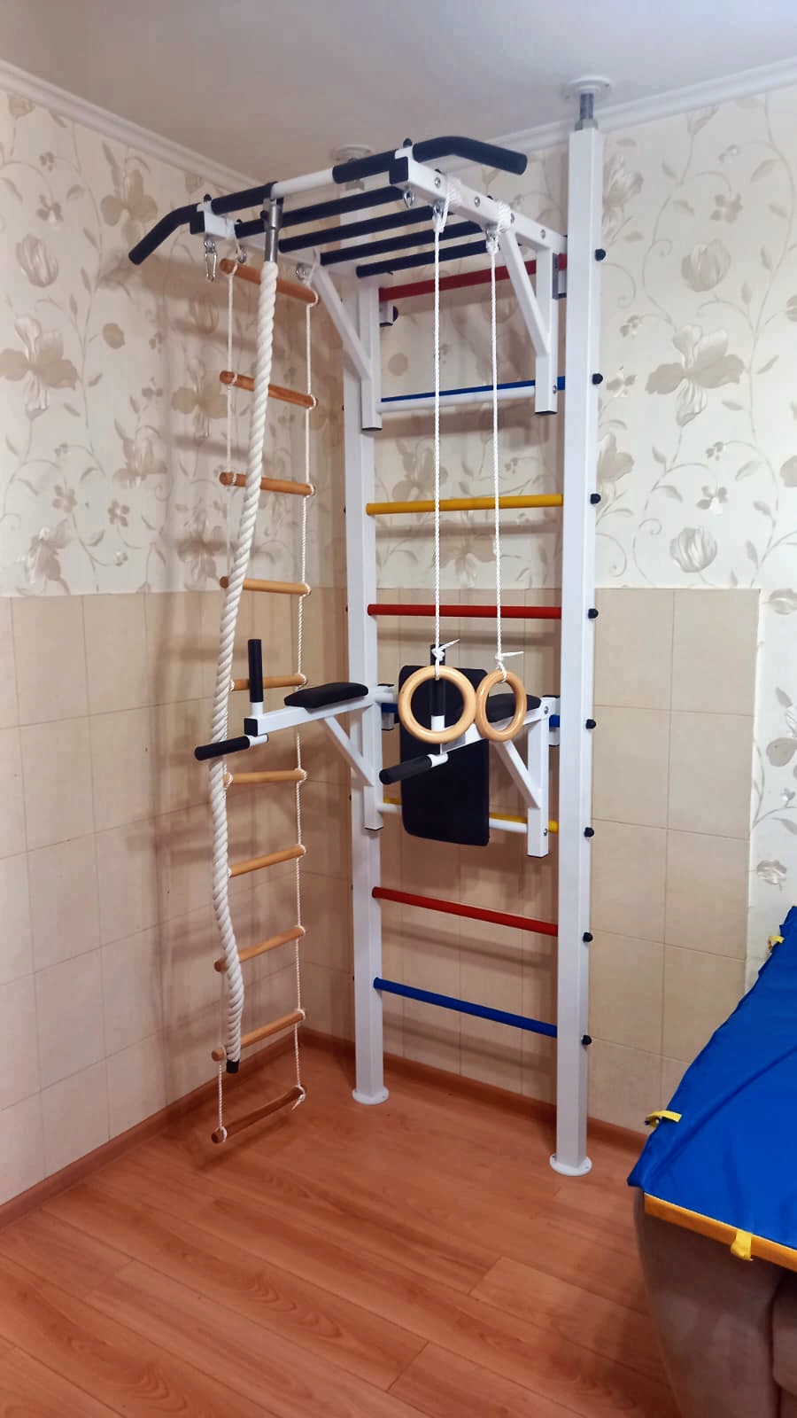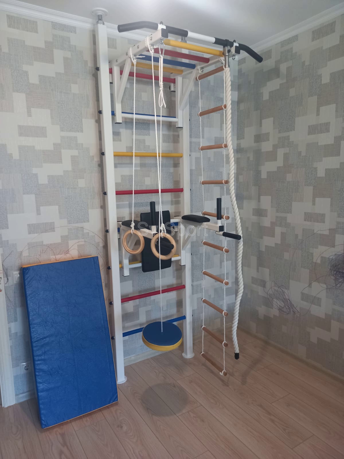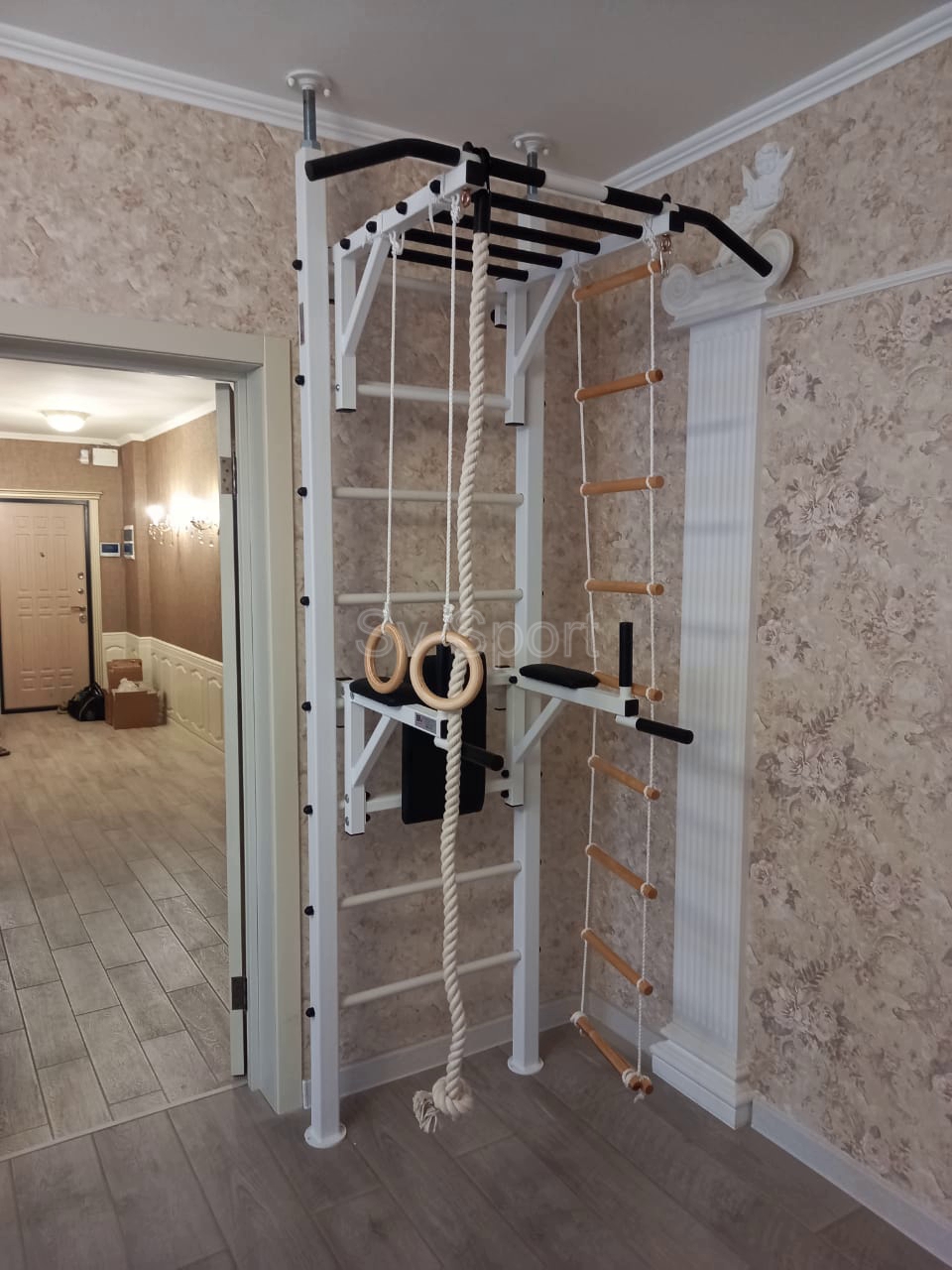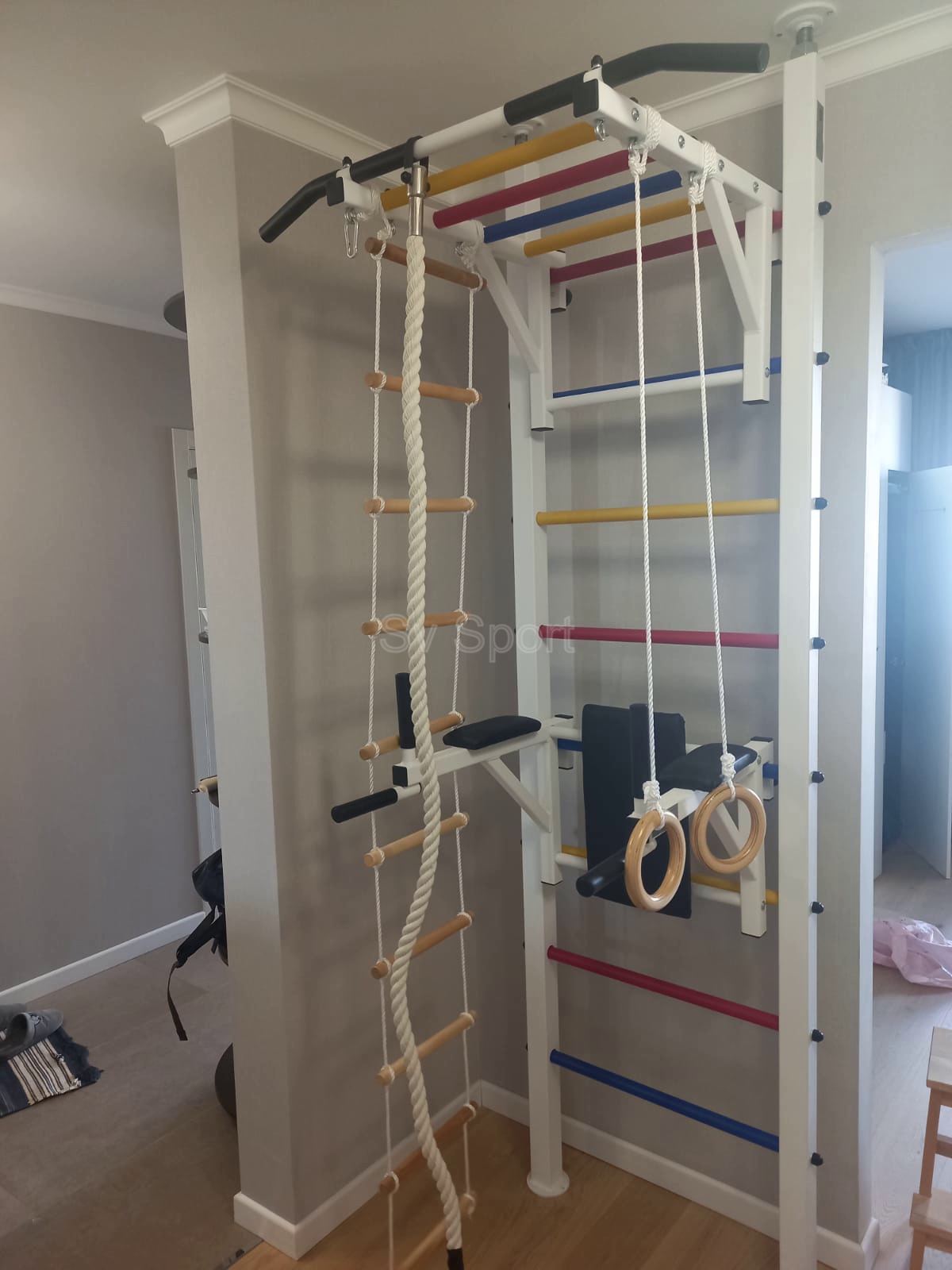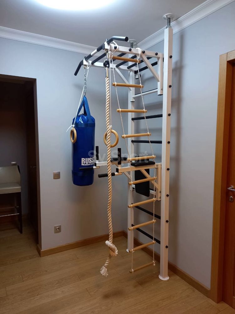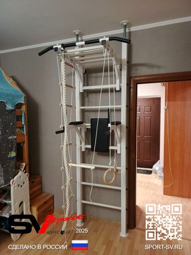 КОМПЛЕКТАЦИЯ: Шведская стенка Sv Sport враспор, Турник Sv Sport рукоход к ШС, Брусья Sv Sport к ШС, Kанат, Kольца деревянные, Лестница веревочная.