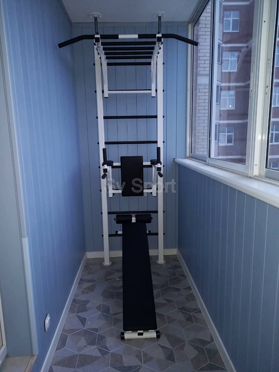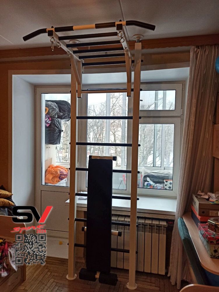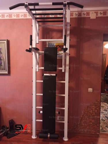 КОМПЛЕКТАЦИЯ: Шведская стенка Sv Sport враспор, Турник Sv Sport рукоход к ШС, Брусья Sv Sport к ШС, Скамья для пресса и жима Sv Sport к ШС.
