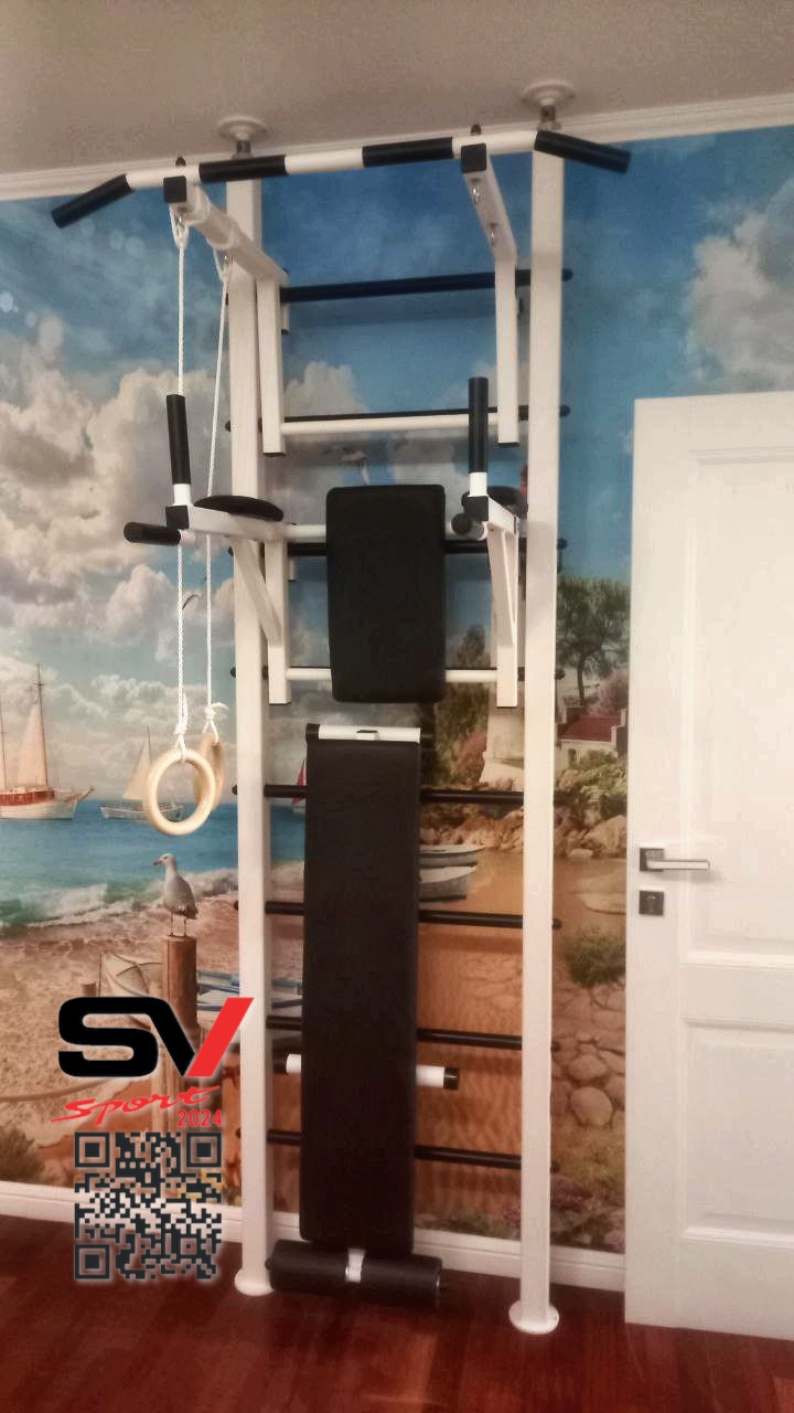 КОМПЛЕКТАЦИЯ: Шведская стенка Sv Sport враспор, Турник Sv Sport стандарт к ШС, Брусья Sv Sport к ШС, Скамья для пресса и жима Sv Sport к ШС, Kольца деревянные.