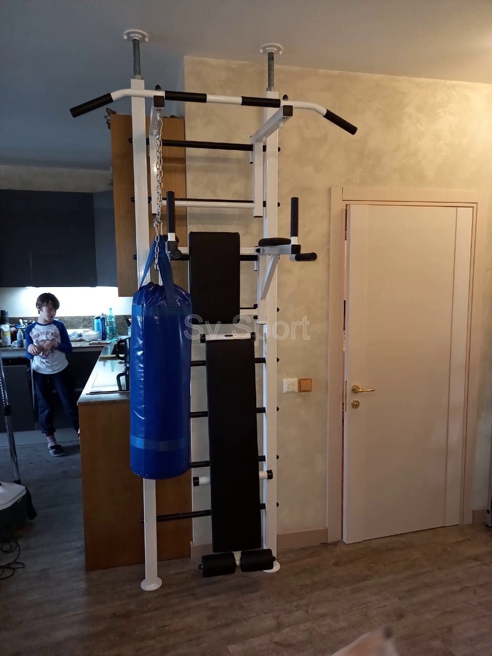 КОМПЛЕКТАЦИЯ: Шведская стенка Sv Sport враспор, Турник Sv Sport стандарт к ШС, Брусья Sv Sport к ШС, Скамья для пресса и жима Sv Sport к ШС, Цепь удлинитель 90см, Мешок боксерский 15кг.