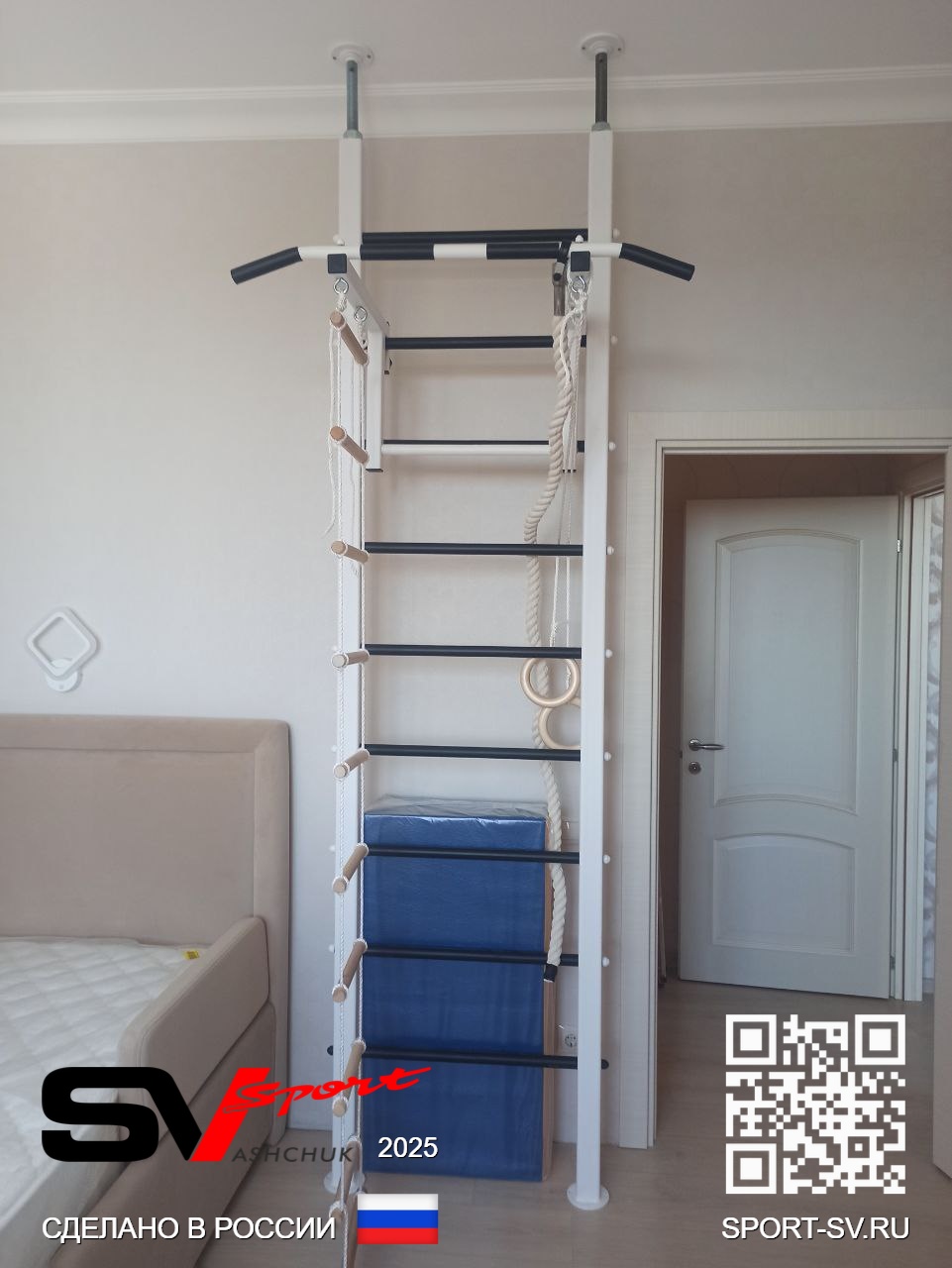 КОМПЛЕКТАЦИЯ: Шведская стенка Sv Sport враспор, Турник Sv Sport стандарт к ШС, Kанат, Kольца деревянные, Лестница веревочная, Спортивный мат 100 х 100 х 10 см складной.