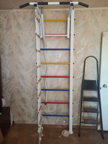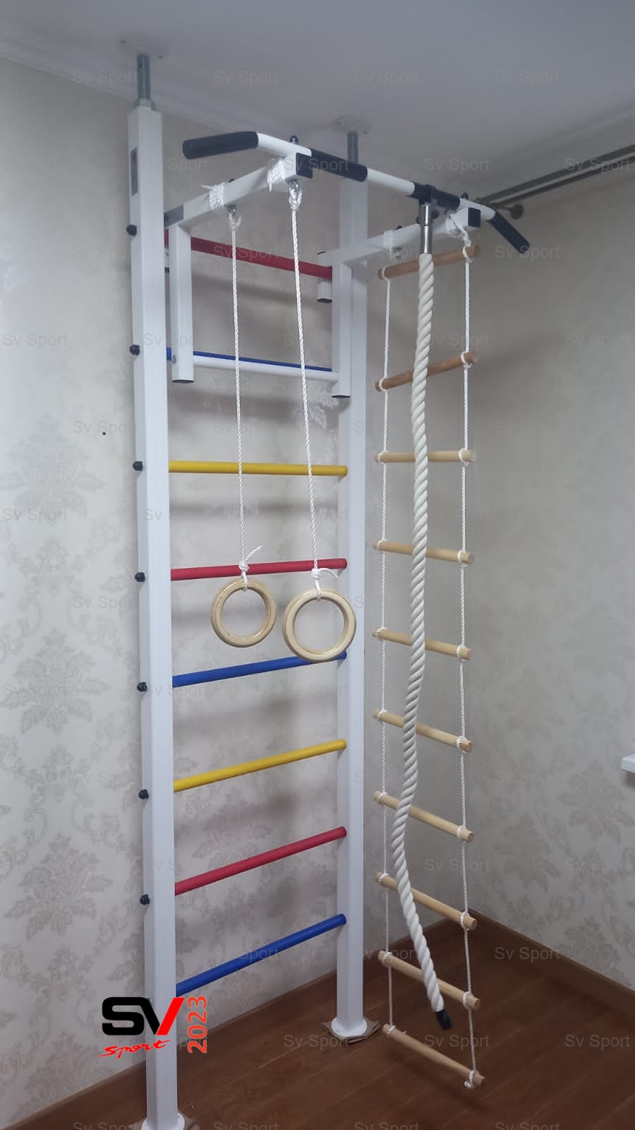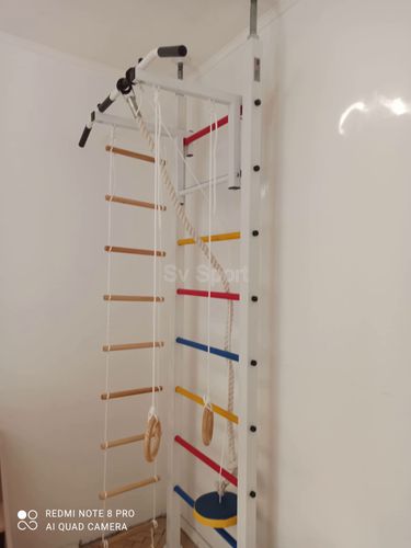 КОМПЛЕКТАЦИЯ: Шведская стенка Sv Sport враспор, Турник Sv Sport стандарт к ШС, Kанат, Kольца деревянные, Лестница веревочная.