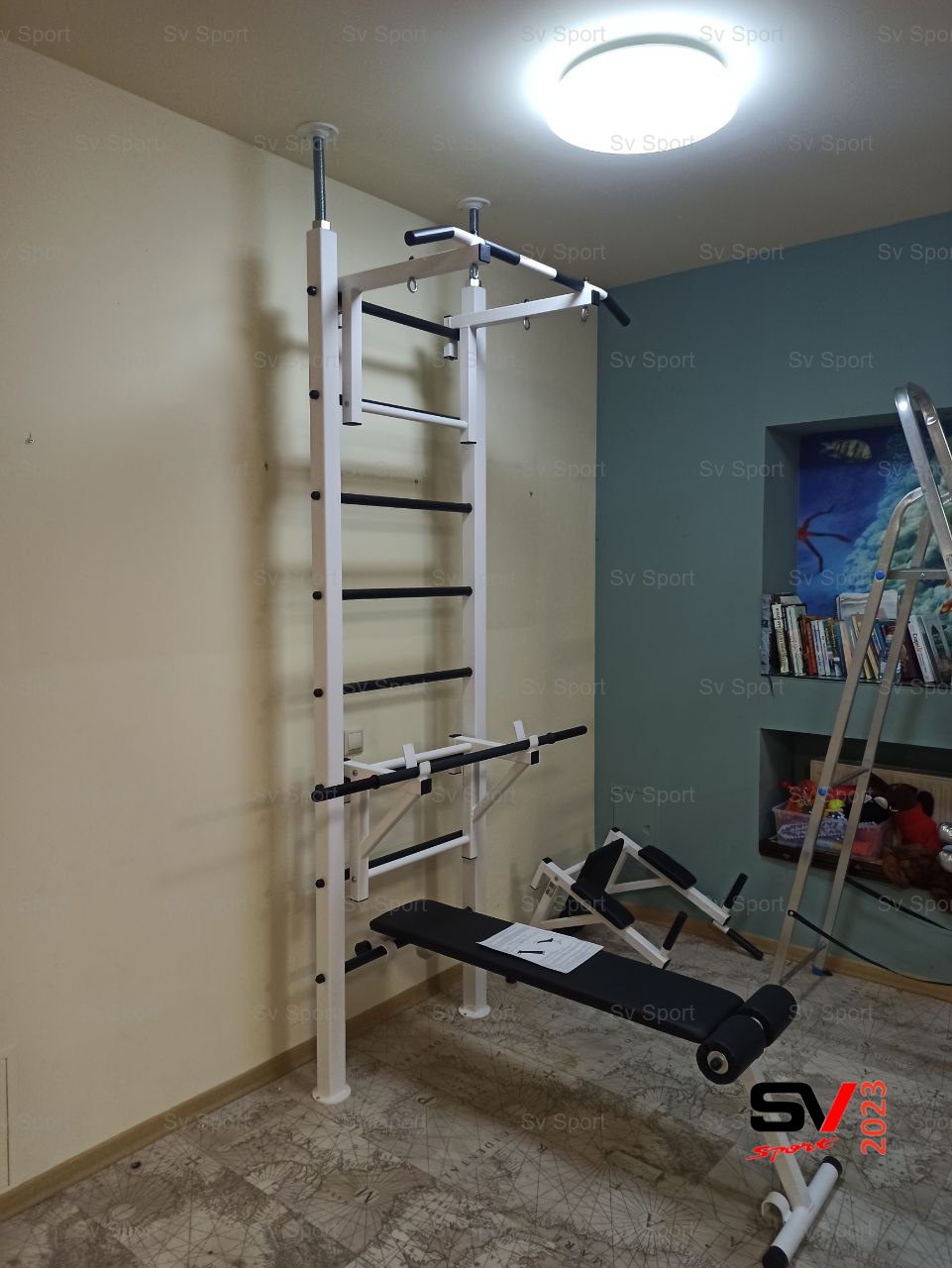 КОМПЛЕКТАЦИЯ: Шведская стенка Sv Sport враспор, Турник Sv Sport стандарт к ШС, Брусья Sv Sport к ШС, Стойка под штангу Sv Sport к ШС, Скамья для пресса и жима Sv Sport к ШС.