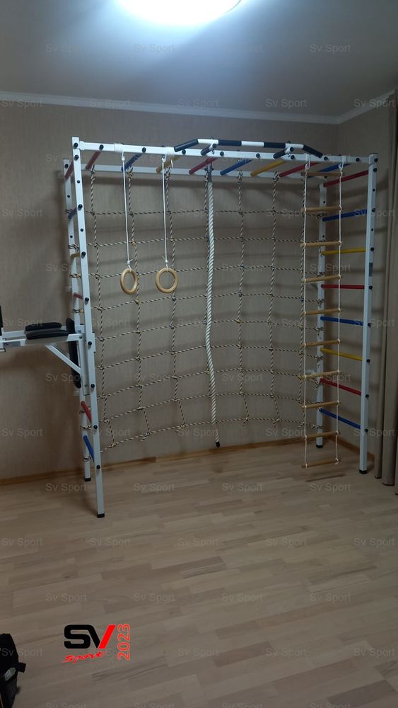 КОМПЛЕКТАЦИЯ: Спортивный комплекс Sv Sport П с турником, Брусья Sv Sport к ШС, Kанат, Kольца деревянные, Лестница веревочная, Сетка к спортивному комплексу П.
