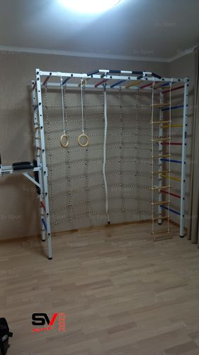 Спортивный комплекс Sv Sport П состоит из двух вертикальных шведских стенок и двухметрового рукохода. Имеет 3 уровня регулировки высоты (растет вместе с Вашим ребенком). В базовую комплектацию входит турник с резиновыми ручками и 7 колец для крепления навесного оборудования. Горизонтальные стойки изготовлены из профильной трубы 40х40х3 мм, вертикальные из профильной трубы 40х40х3 мм. Ступени и перекладины изготовлены из круглой, стальной трубы, покрытой резиной (не скользят, не натирают мозоли, не прокручиваются, не имеют запаха, приятны на ощупь). Устанавливается к стене при помощи 6 кронштейнов к стене. Турник изготовлен из круглой трубы D30 мм., в местах хватов, одеты резиновые ручки. Окрашен качественной, импортной порошковой краской в 2 этапа, устойчивой к коррозии, истиранию и температурным перепадам. Все торцы, болты, гайки заглушены пластиковыми заглушками.