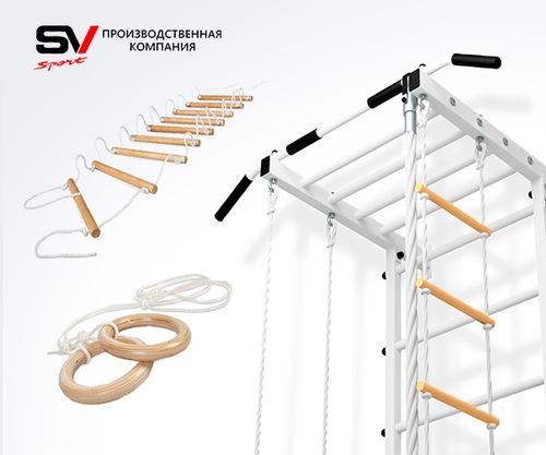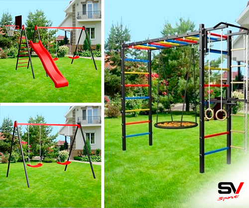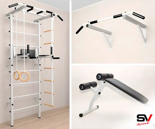 КОМПЛЕКТАЦИЯ: Каркас УШС Sv Sport Рукоход, Брусья Sv Sport к УШС, Стойка под штангу Sv Sport к УШС, Скамья для пресса и жима Sv Sport к УШС, Качели пластиковые со спинкой на цепях, Кронштейн для подвеса боксерского мешка.