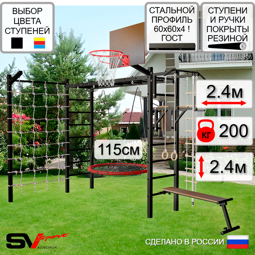 КОМПЛЕКТАЦИЯ: Каркас УШС Sv Sport Рукоход, Турник Sv Sport стандарт к УШС, Брусья Sv Sport к УШС, Скамья для пресса и жима Sv Sport к УШС, Качели - гнездо 115см, Щит баскетбольный Sv Sport c кронштейном к УШС Sv Sport, Кронштейн для подвеса боксерского мешка, Комплект: канат с крепежом, кольца гимнастические деревянные, лестница веревочная, Сетка к спортивному комплексу, Комплект турник прямой.