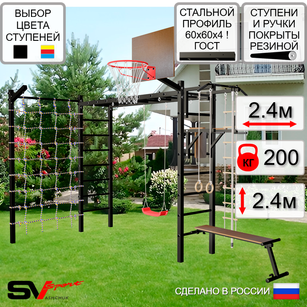 КОМПЛЕКТАЦИЯ: Каркас УШС Sv Sport Рукоход, Турник Sv Sport стандарт к УШС, Брусья Sv Sport к УШС, Скамья для пресса и жима Sv Sport к УШС, Качели пластиковые "Лодочка", Щит баскетбольный Sv Sport c кронштейном к УШС Sv Sport, Кронштейн для подвеса боксерского мешка, Комплект: канат с крепежом, кольца гимнастические деревянные, лестница веревочная, Сетка к спортивному комплексу, Комплект турник прямой.